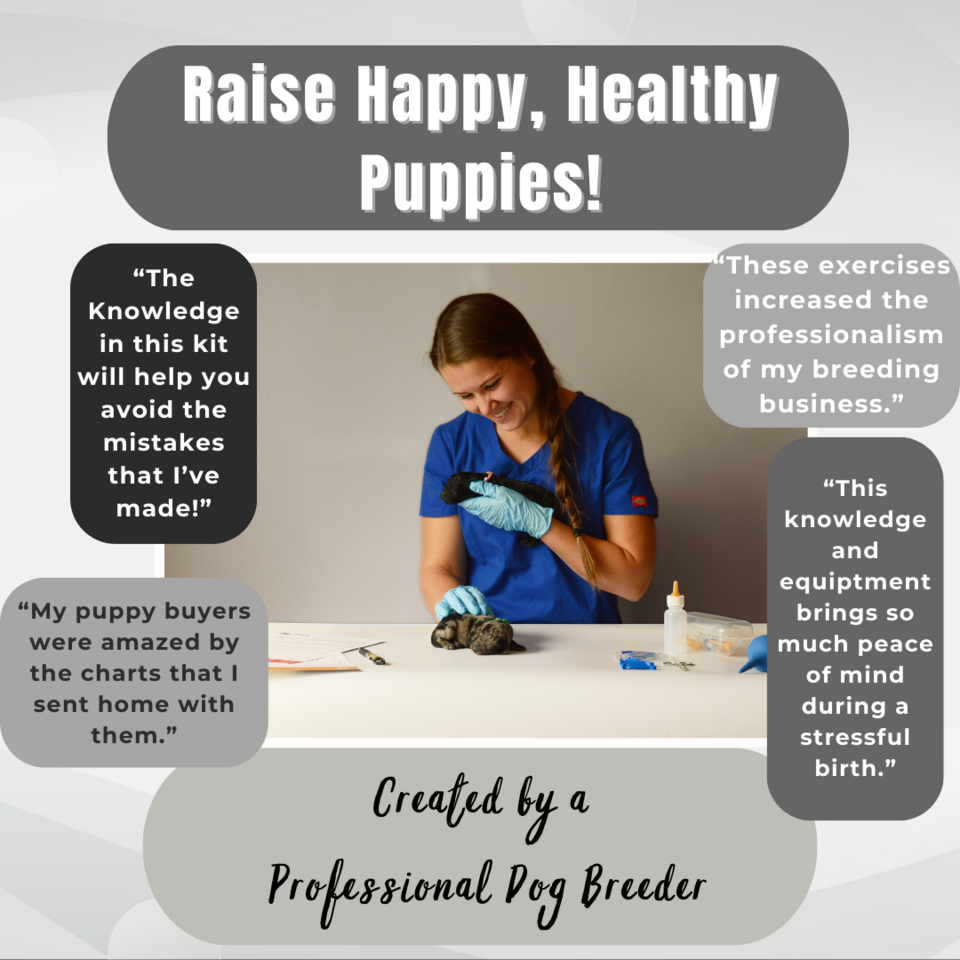 The birthing kit includes 14 infographics/charts. Reduce stress by learning: how to encourage milk production, what questions to ask your vet, and how to recognize when labor is starting. Learn about typical puppy development and how to conduct 3 essential exercises to help puppies decrease fear/anxiety, develop their sense of smell, and live healthier lives. Stay organized by recording: puppies’ weights (daily and weekly), supplemental feedings, vaccination or deworming, and new families’ information.