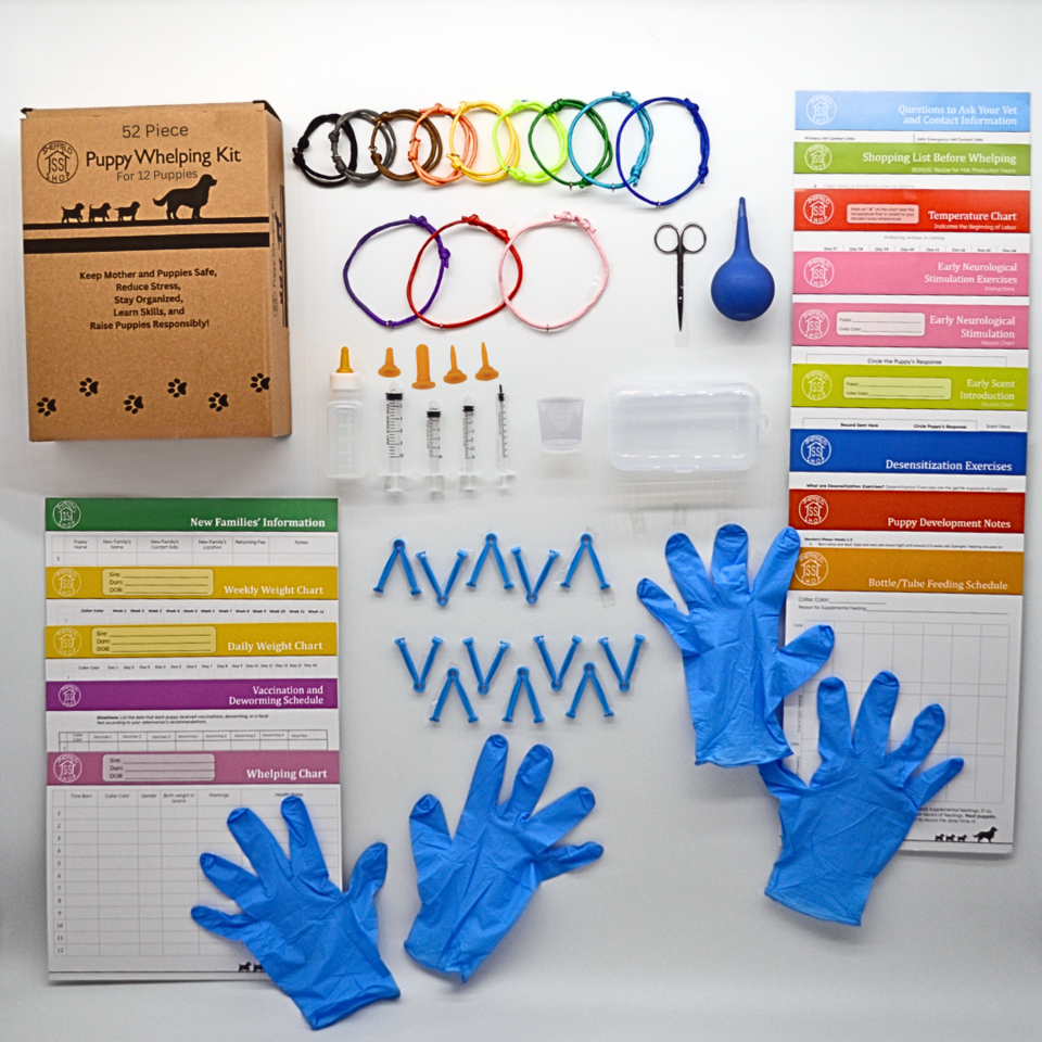 Our 52 Piece puppy whelping kit was designed by a professional breeder to ensure that responsible dog owners have all the skills they need for birthing puppies of large and small breeds.