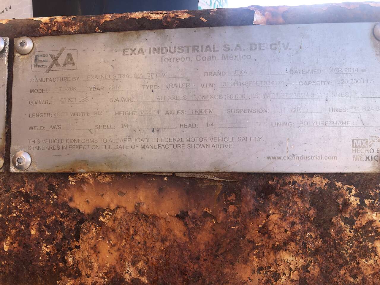 2014 EXA 48' x 102" 165 barrel tank trailer. Has one lift axle and aluminum wheels. Needs sandblasted, repainted, and some interior baffle repair. Asking $8,500, but will entertain offers. Located in Roosevelt, UT