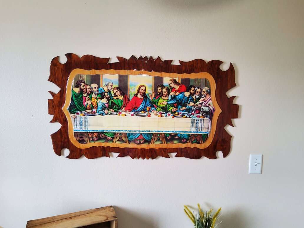 X-large vintage last supper lacquered wood wall hanging. 42" x 23"