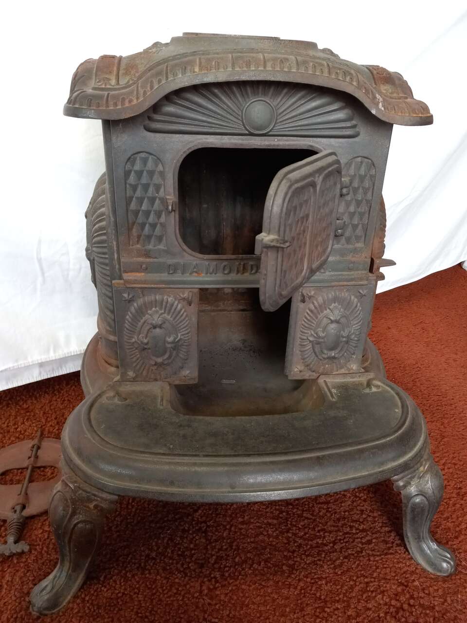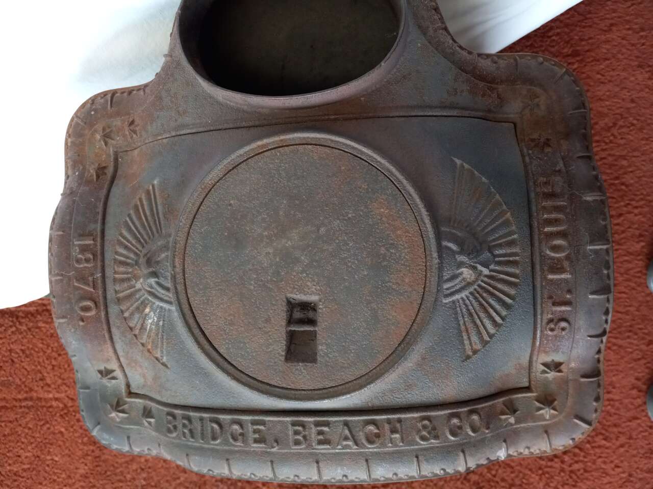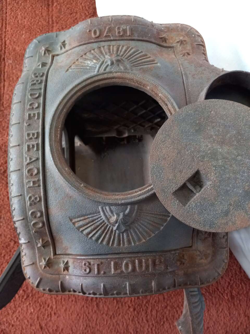A small, complete, 1870 dated, antique wood burning stove. It was made by Bridge, Beach & Co. of St. Louis. It has 4 openings for stocking wood or cleaning. There are NO broken or missing parts. Included is a lid lifter and damper.