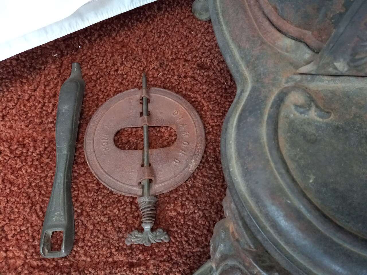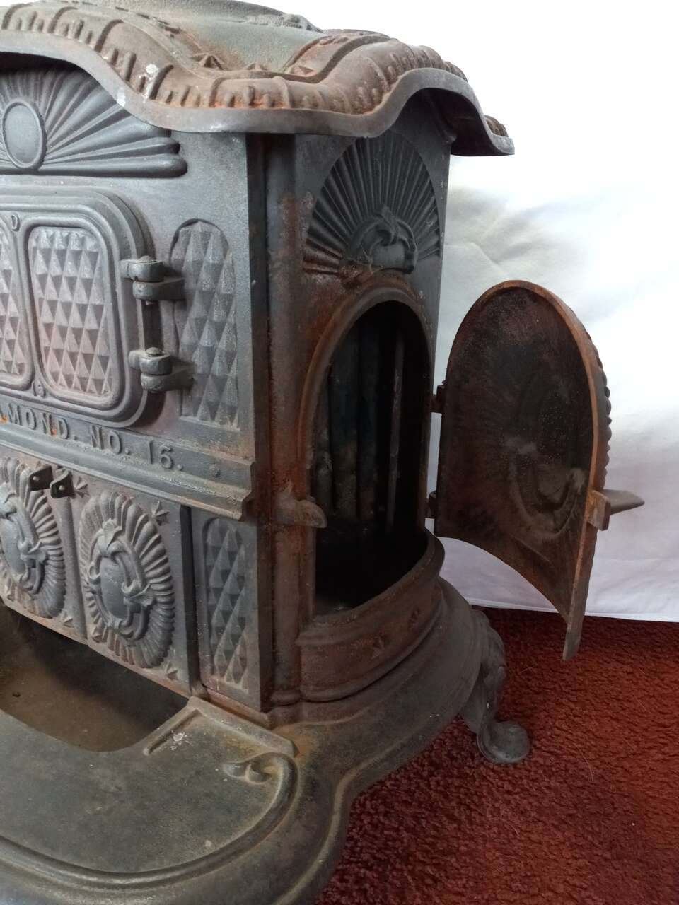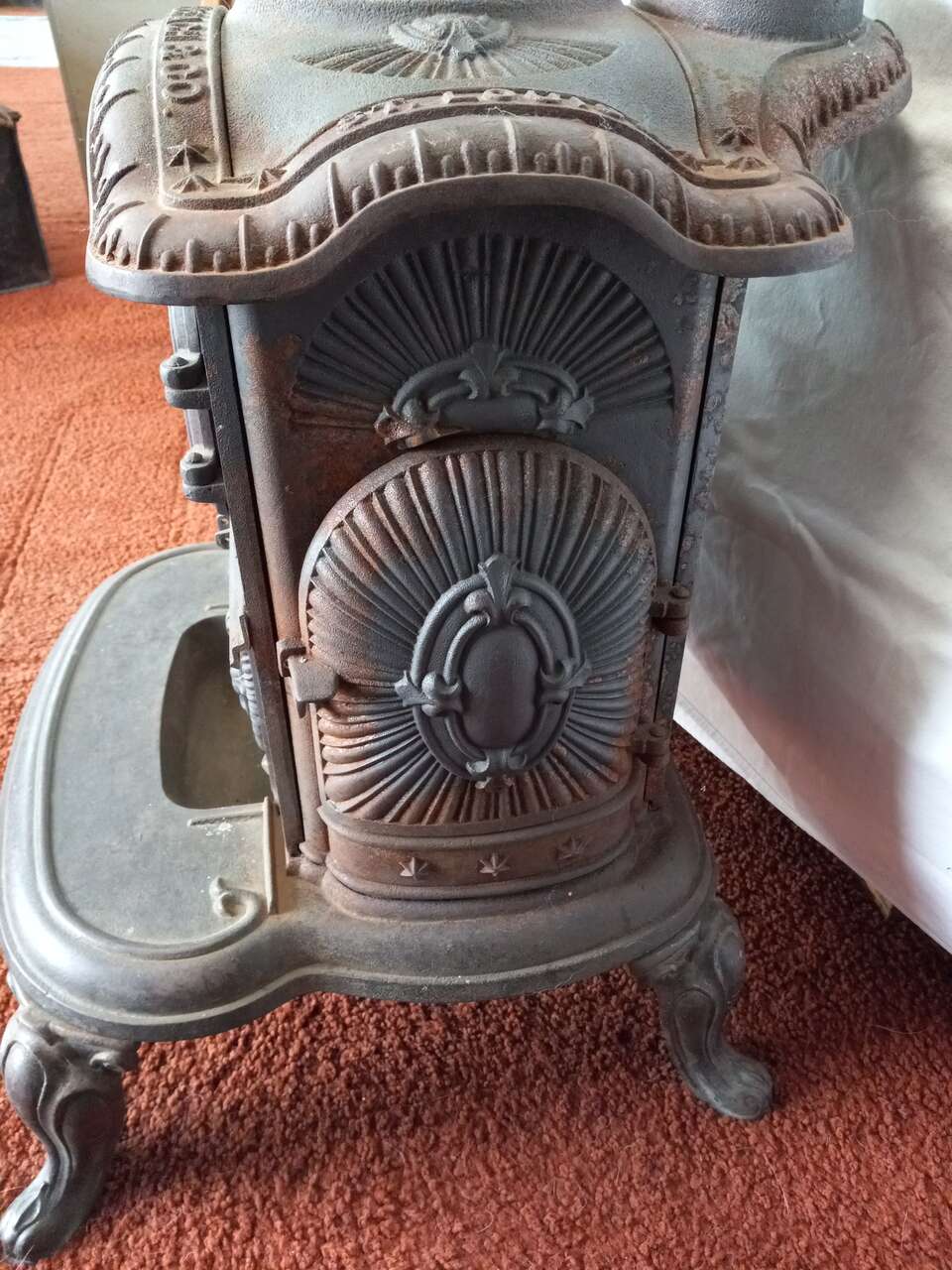 A small, complete, 1870 dated, antique wood burning stove. It was made by Bridge, Beach & Co. of St. Louis. It has 4 openings for stocking wood or cleaning. There are NO broken or missing parts. Included is a lid lifter and damper.