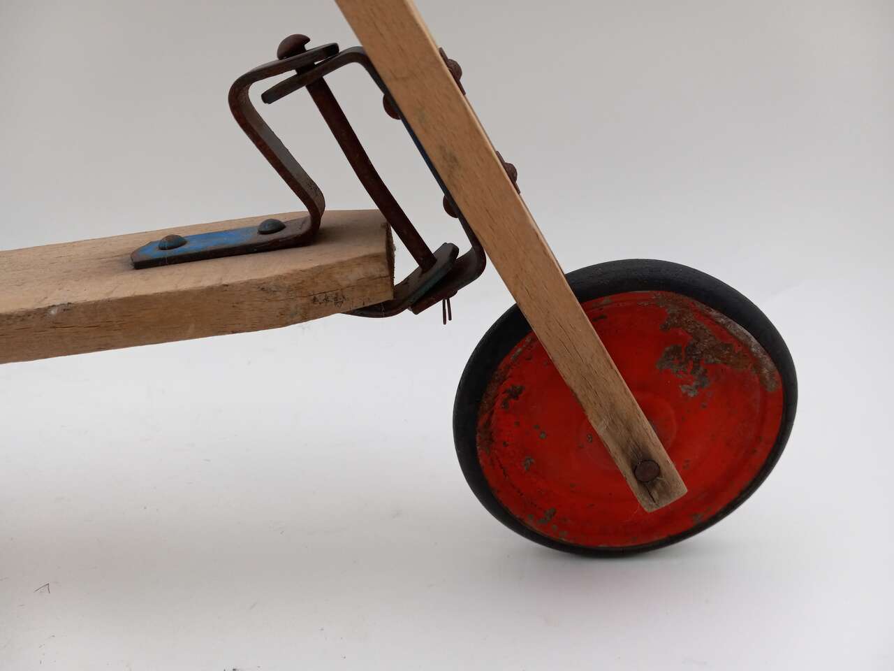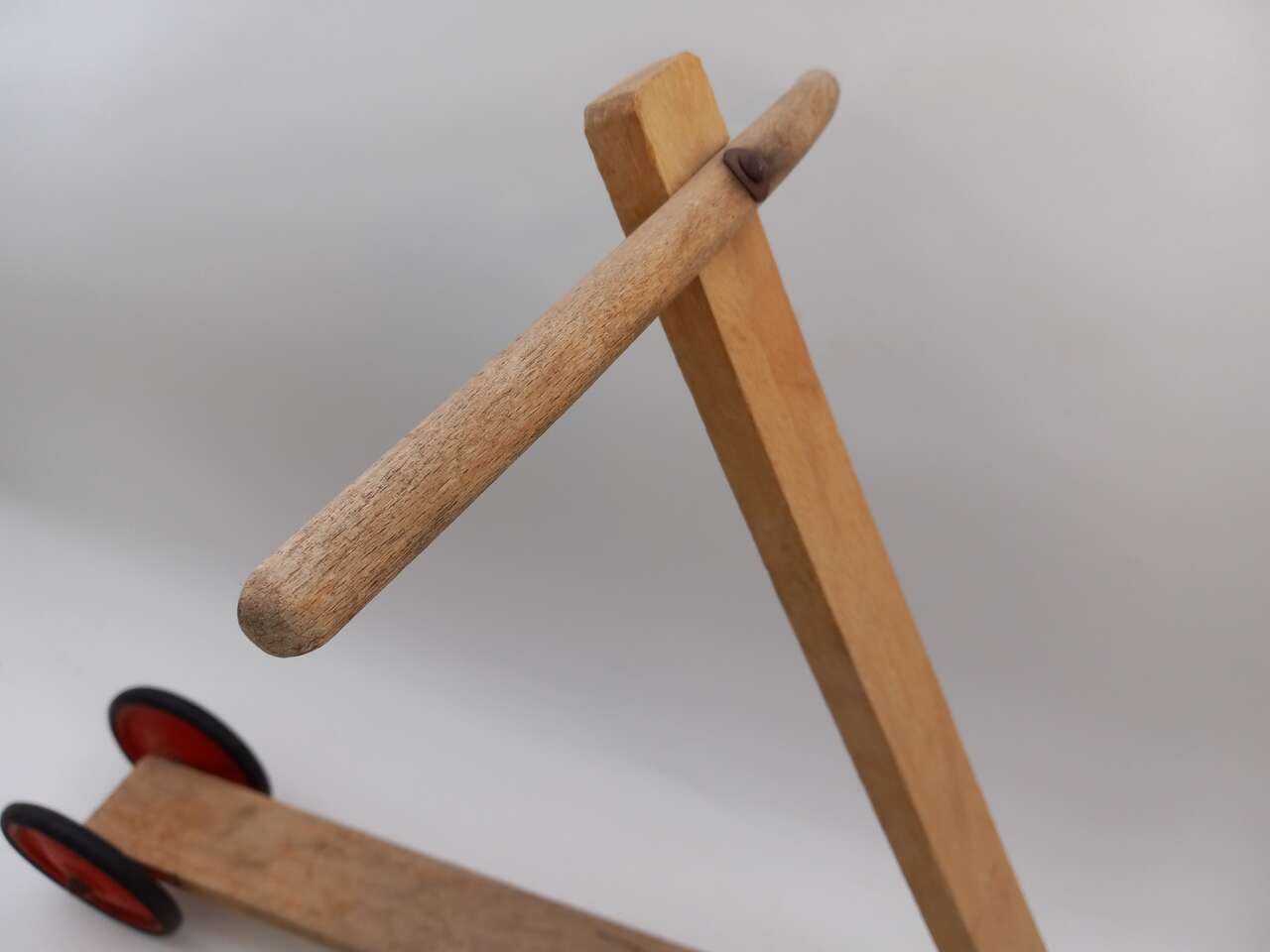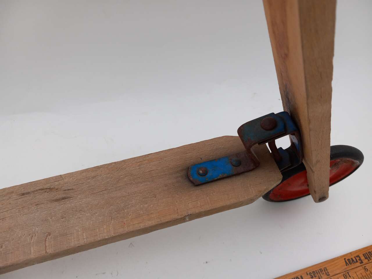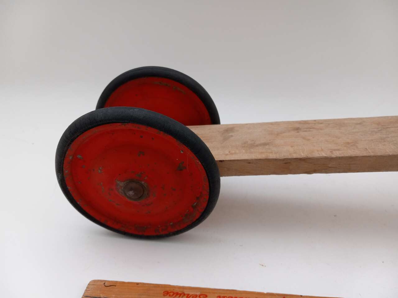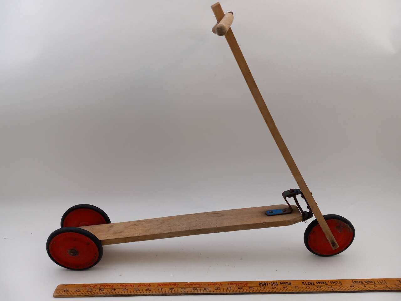 A nice old wood scooter in excellent condition for its age. It has red wheels and its original rubber tires. It was never painted, just raw wood.