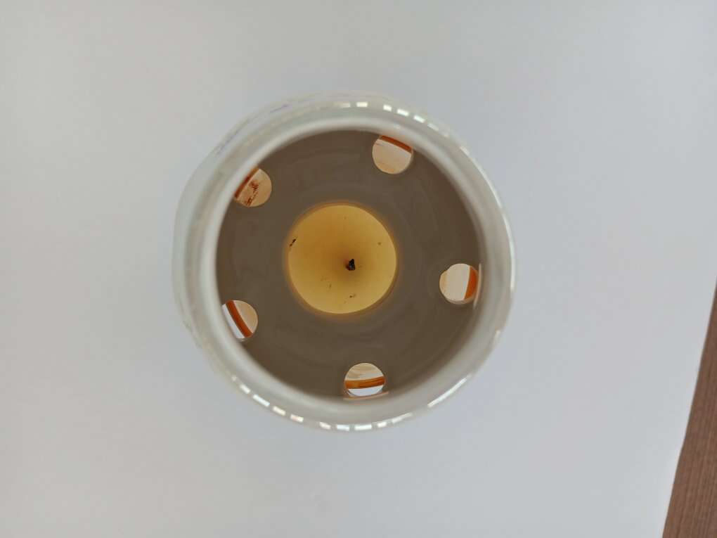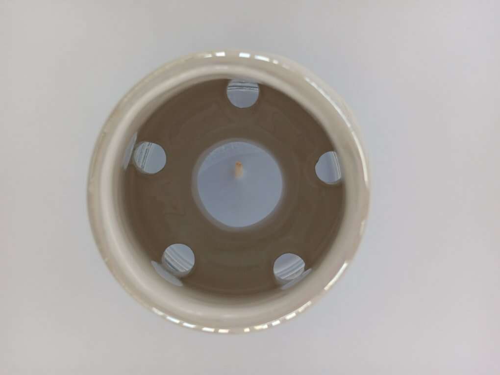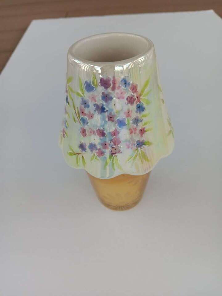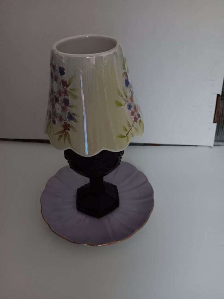 VenmoPrice reduced from $8 to $5. Perfect condition. Glazed ceramic with scalloped bottom edges. Ventilation holes around bottom. Use on larger candles (Yankee, Candle-Lite, etc), or small and medium size glass candles as pictured. Floral design in blue-purple-pink tones. I displayed on a decorative plate, have never used over a burning candle, so no burn or smoke marks