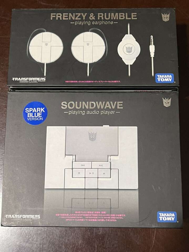 Transformers Music Label Soundwave spark blue version MP3 player and Frenzy and Rumble headphones. New in unopened boxes. Soundwave uses a single AAA battery and a micro sd card to hold the music. Frenzy and Rumble are working headphones