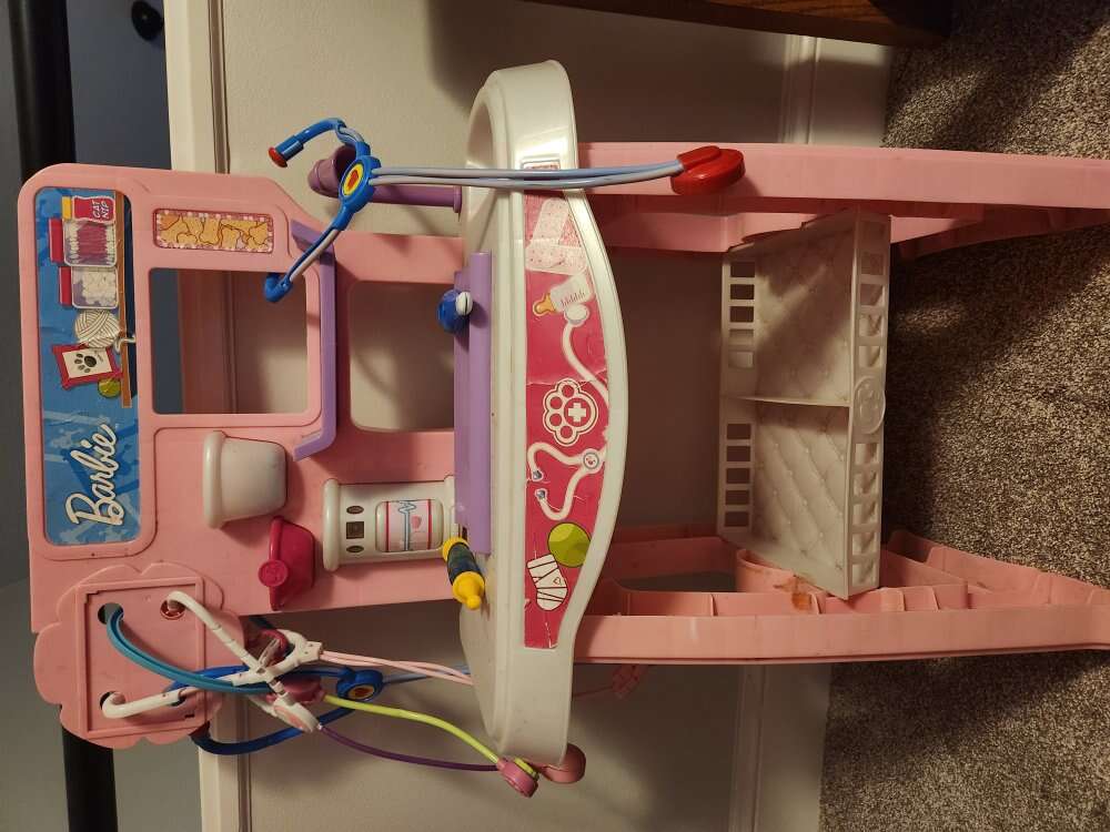 Barbie Pet Vet Groomer Station Includes: 5 stethoscopes, one thermometer, and one shot. Thermometer shows "ill" and "healthy" levels. Dusty but nothing broken