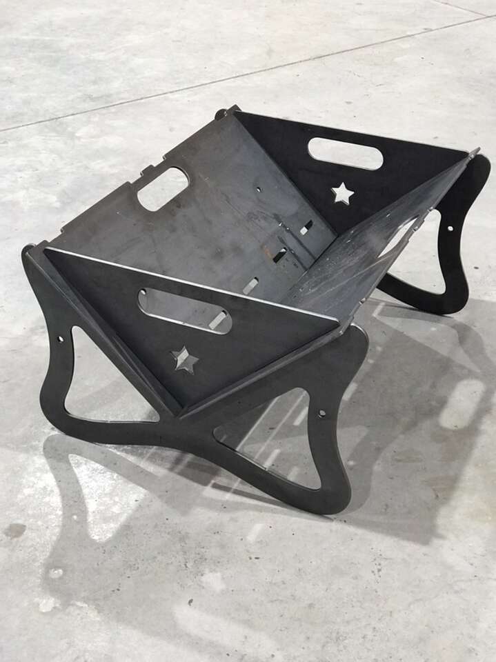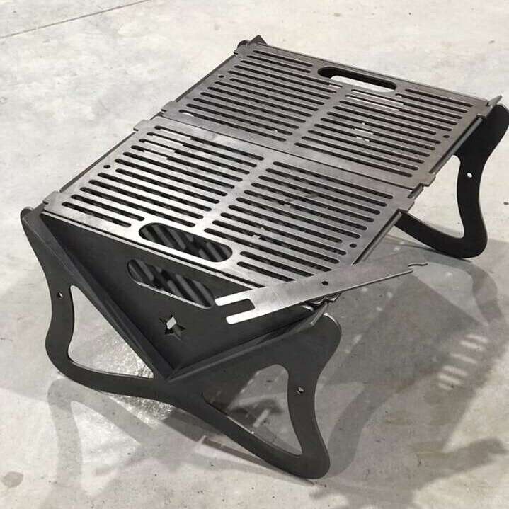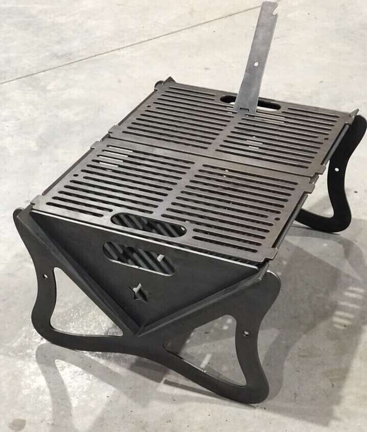 Collapsible fire pit grill. Portable/packable, stores out of the way when not in use. Perfect balance between size/weight. Great for backyard fires or for camping. Slots together quickly for a sturdy fire pit or grill. Includes fire pit and grills and comes with a bottle opener/grill remover to put the grills on/off while hot. Bolts together using 1/4-20 bolts (also included) for easy transport or storage. Take care of the grills the same way you would take care of a cast iron pan. Coat the fire pit in vegetable oil after each use or let it rust for a nice patina. Made with mild steel. Built to last years!