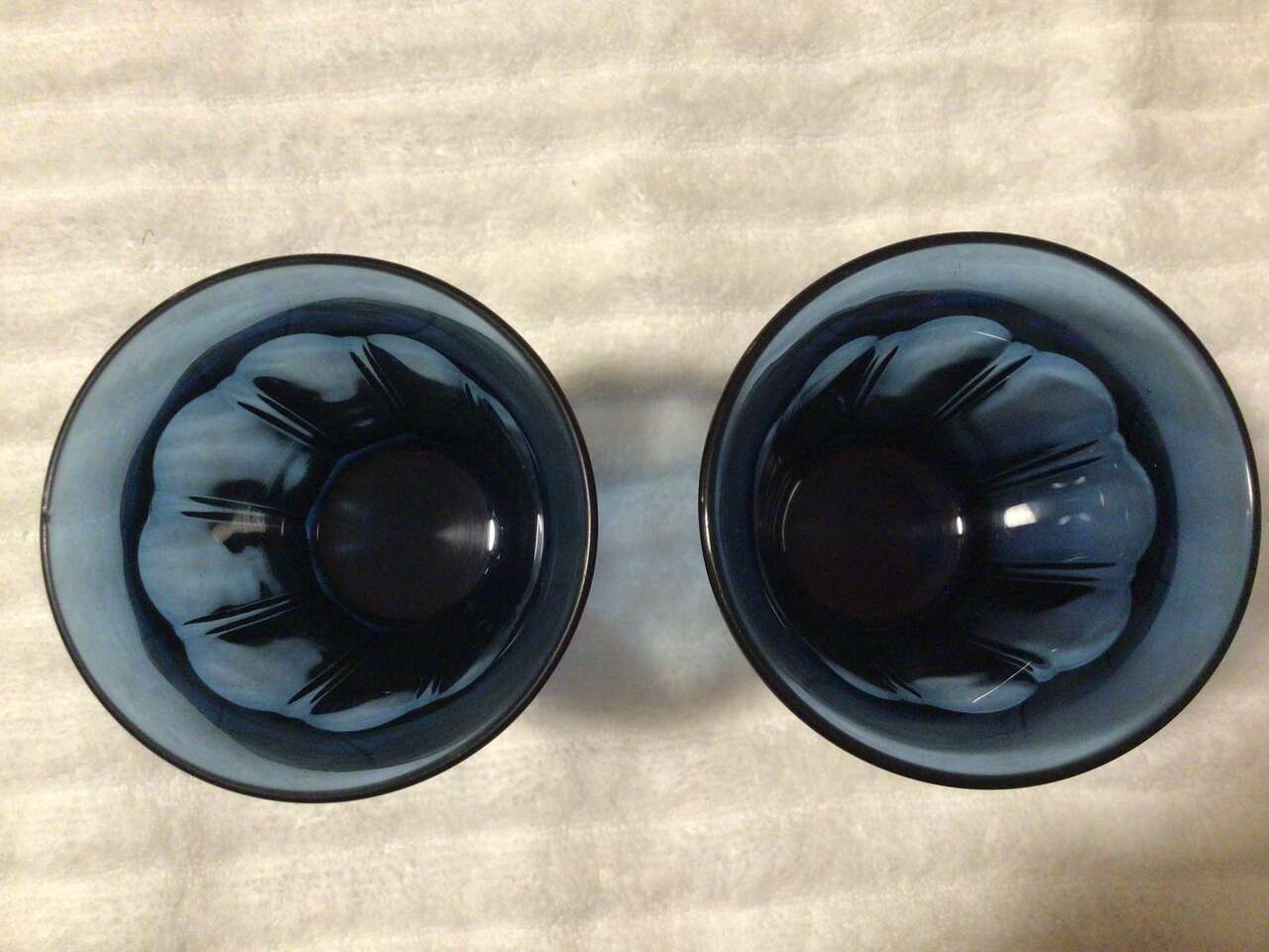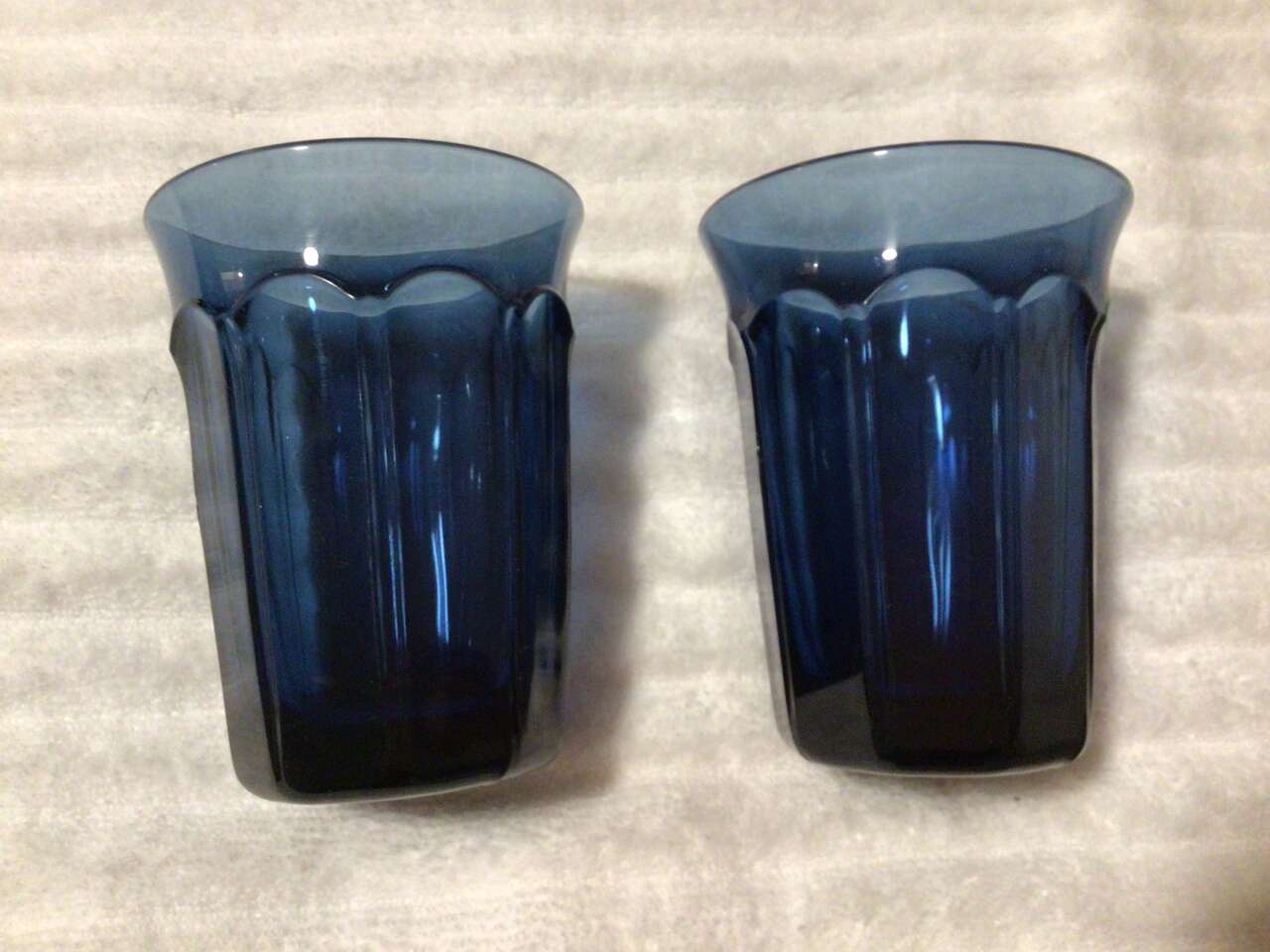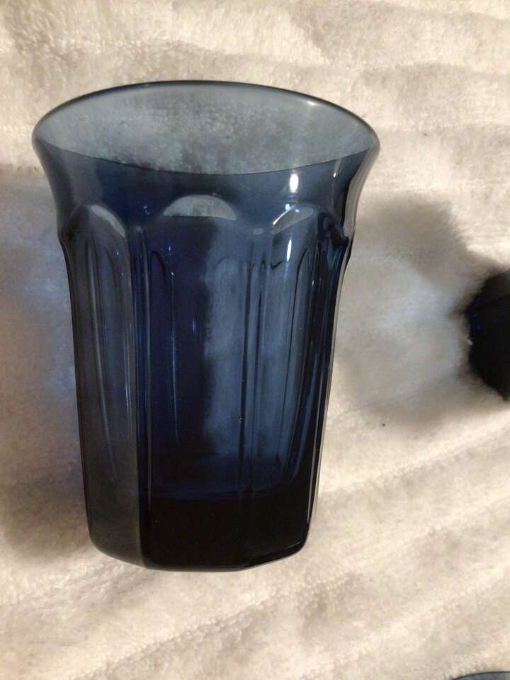 This listing is for 8 dark blue glasses made by Noritake, pattern Provincial, 6 juice 3.5" tall, 2 water 4 5/8" tall. Nice!