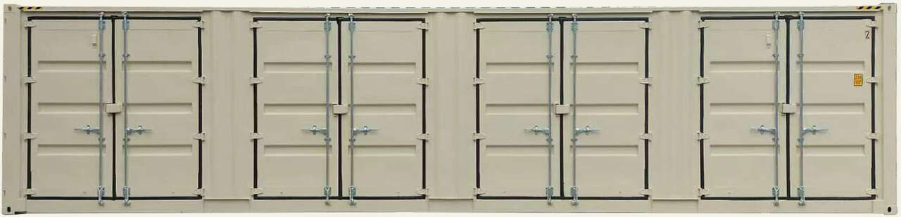 ZelleThis here is the ultimate container! Five sets of doors are on this container, 1 set on the end and 4 sets on the side for maximum accessibility to your stuff. It measures 40' long x 8' wide x 9' 6" tall. Every set of doors seal completely to keep pests, rodents, dust, snow and water out.