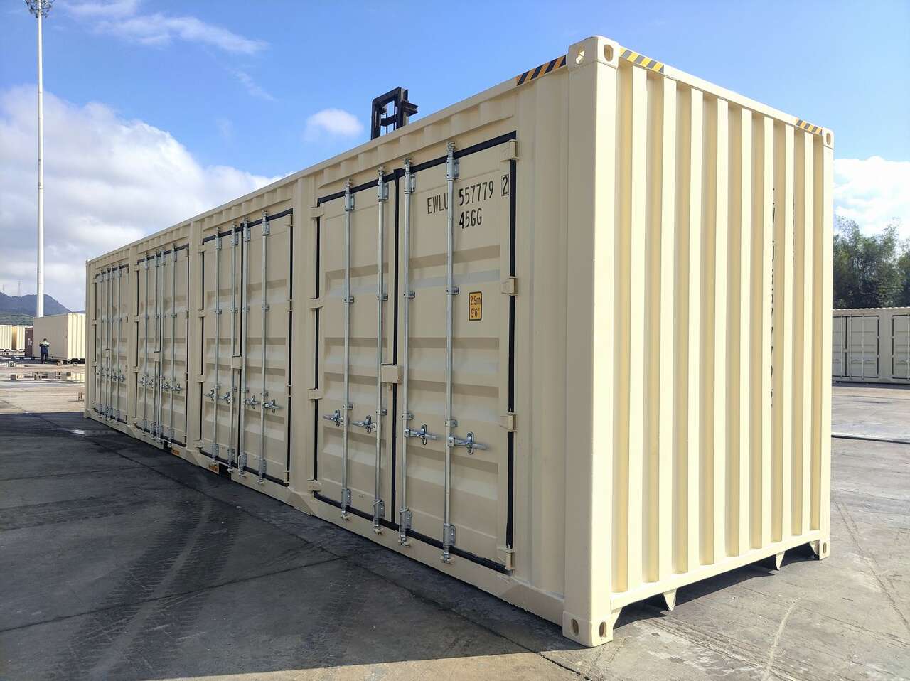 ZelleThis here is the ultimate container! Five sets of doors are on this container, 1 set on the end and 4 sets on the side for maximum accessibility to your stuff. It measures 40' long x 8' wide x 9' 6" tall. Every set of doors seal completely to keep pests, rodents, dust, snow and water out.