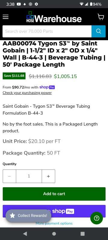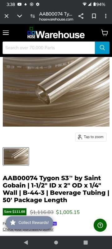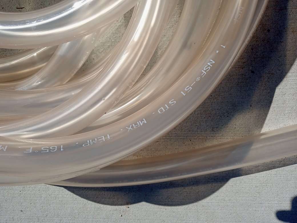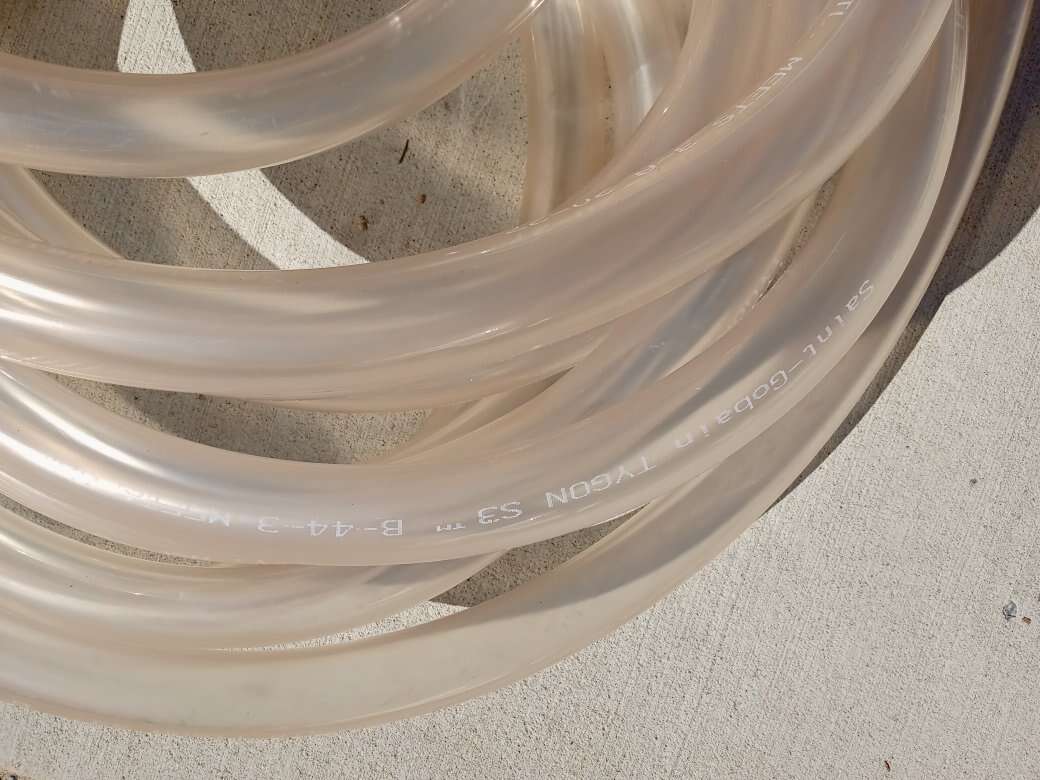 Brand new never used Saint-Gobain Tygon S3 meet NSF -61 Max temperature 165° f a t l meets 3-a 20 to 27 50 ft length. This is large tubing one and a half inch inner diameter by 2 in outer diameter. The hose wall is a quarter inch thick. This is super expensive hosing to buy. This would be good for a brewery or some type of drink making process. Or other industrial uses.