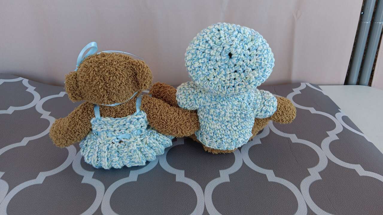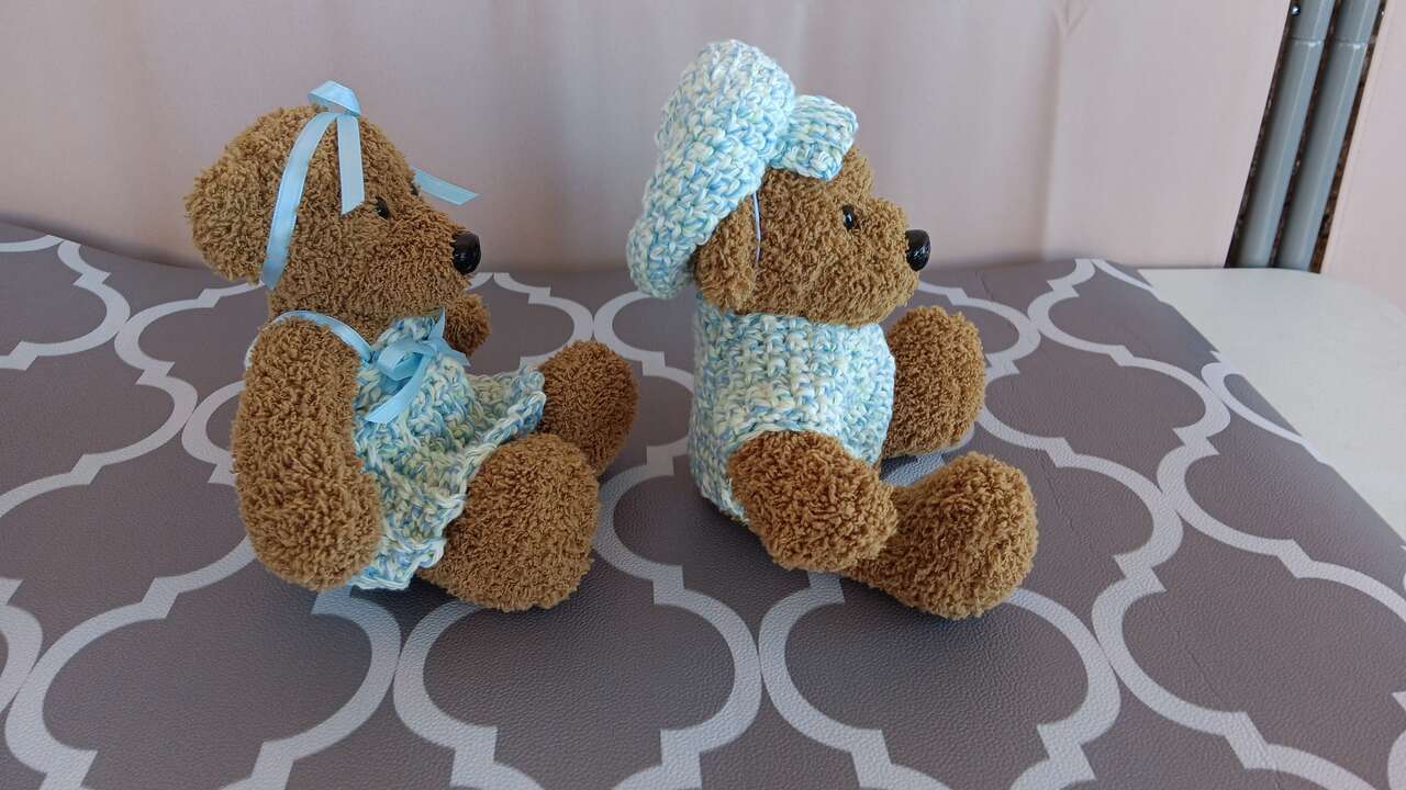 “Sylvie & Bruno”, set of 2, six inch sitting, bears beautifully dressed in handmade outfits. Each bear has its own unique outfit (no patterns used). All new materials. Made for decorative purposes (some pieces may pose choking hazard to children). Please mention “Sylvie & Bruno” when contacting for purchase, as we have other bears for sale.