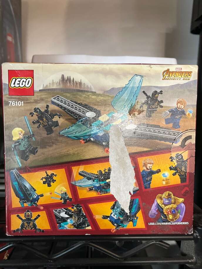 VenmoLego Marvel Outrider Dropship Attack 76101 - Retired set The front of the box has some price tag sticker residue. The back of the box has some of the picture torn off. See photo. The box is factory sealed