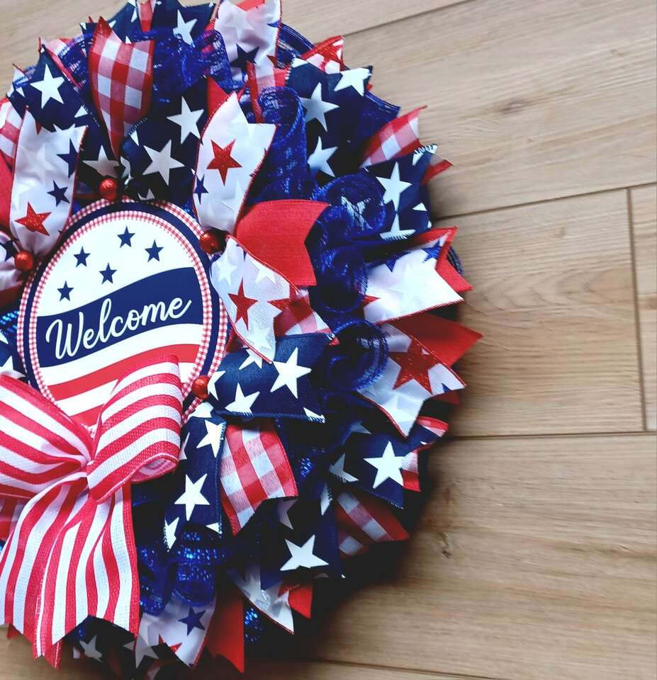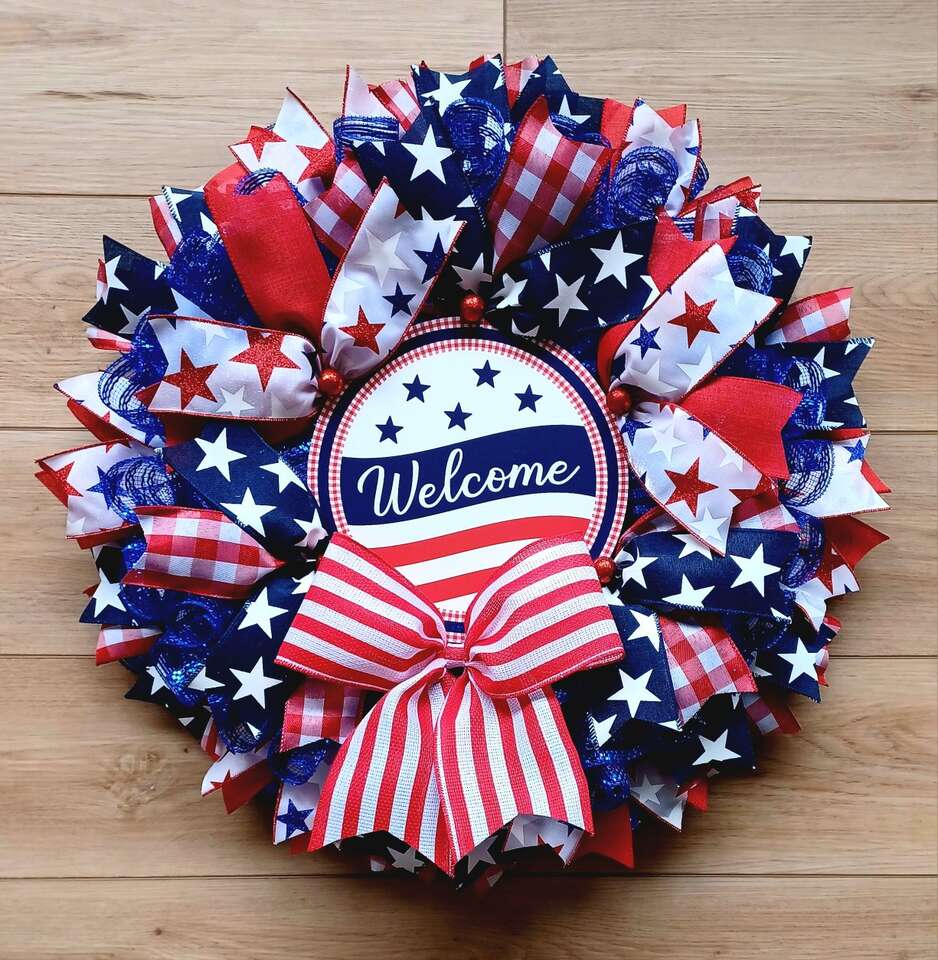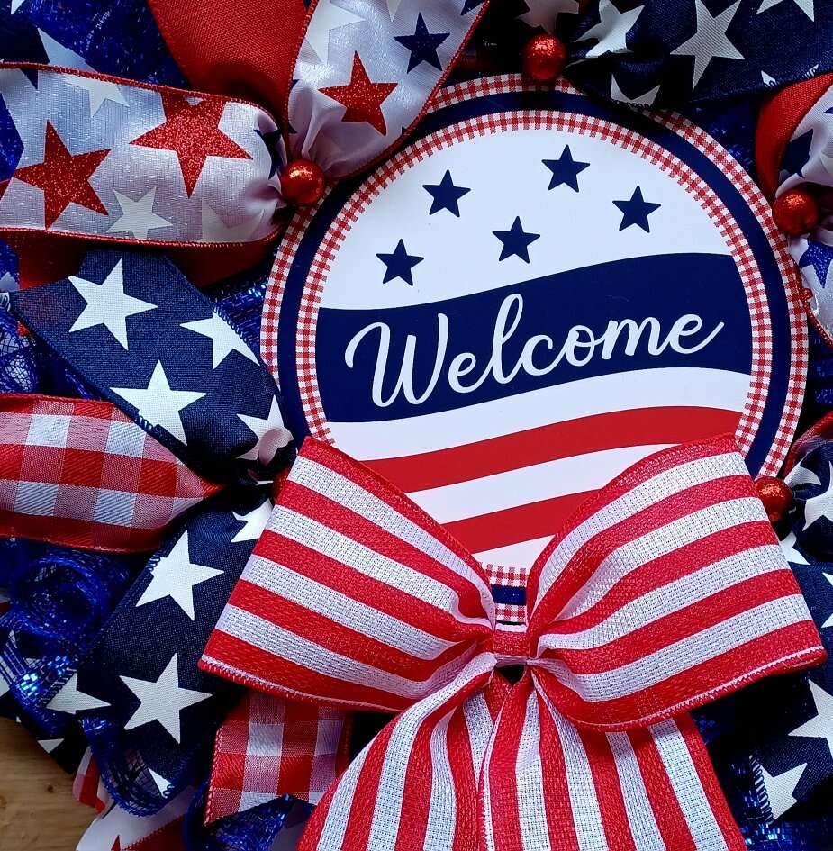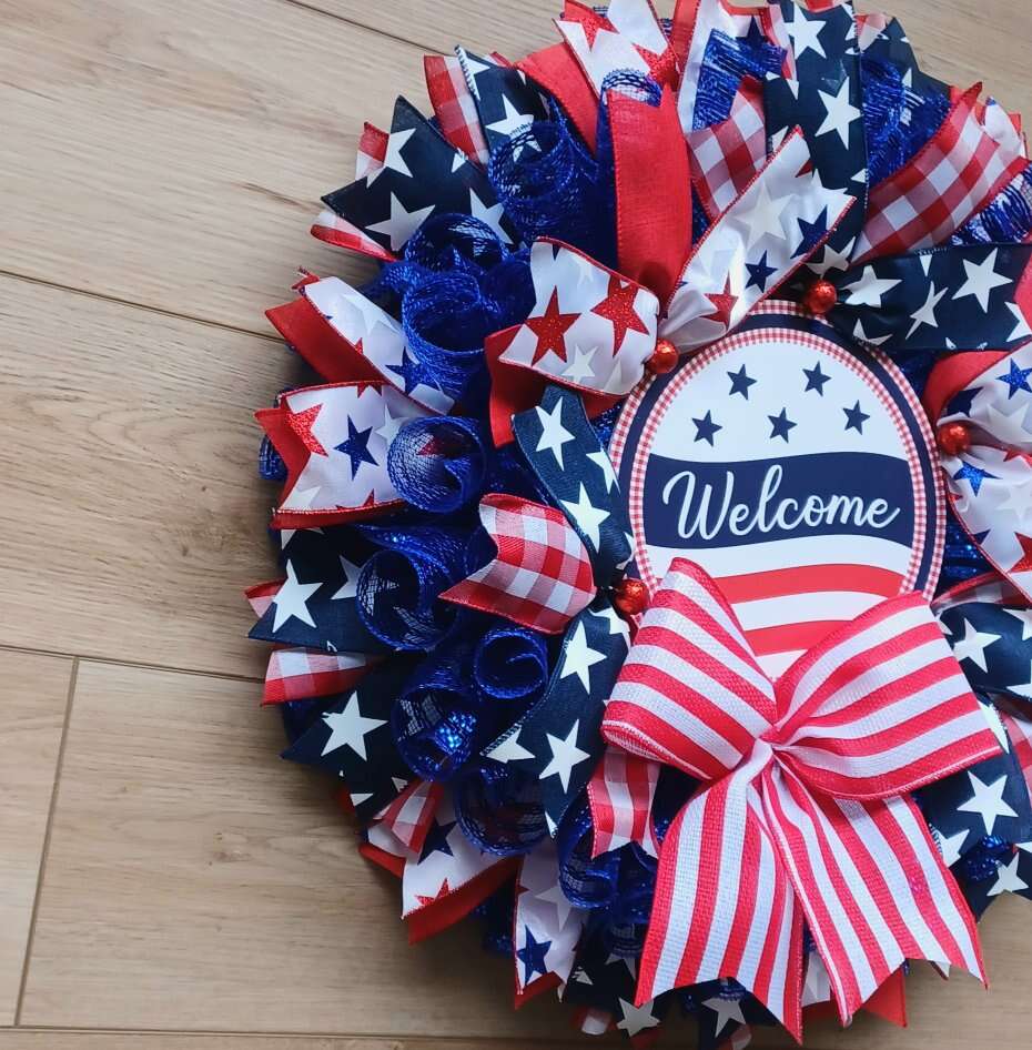 Show your patriotism in the upcoming holidays with this colorful new handmade 24" Patriotic Welcome Wreath with lots of ribbon and a bright welcome sign ready for display from a smoke free home. I can customize and ship. Just ask!!!