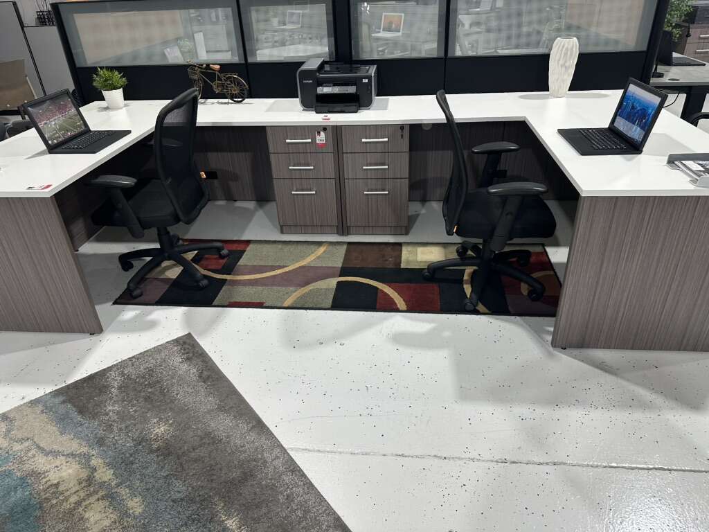 5’-6” x 6’-6” L-Shaped desk. Brand new and in stock. White top and grey wood grain base.