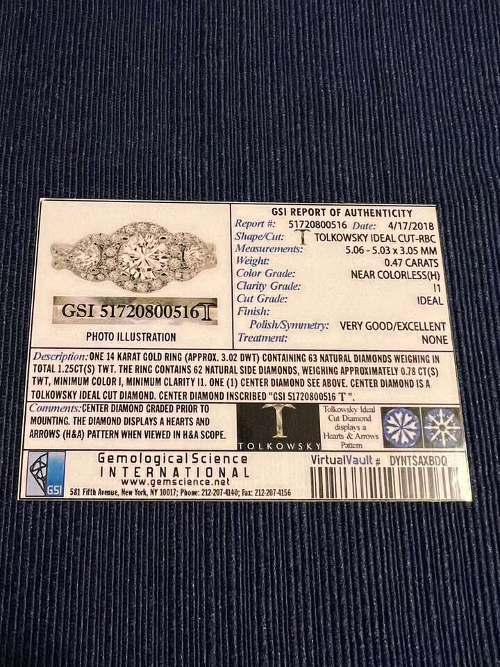 The pictures do not do this ring justice. It is absolutely beautiful! Authentic Tolkowsky diamond setting. Original owner. Purchased in 2020 at Kay’s Jeweler. Retailed at 5499.99. Ring was inspected and cleaned by Kay’s jeweler in April 2024. Asking price is firm. Ring is a size 5.