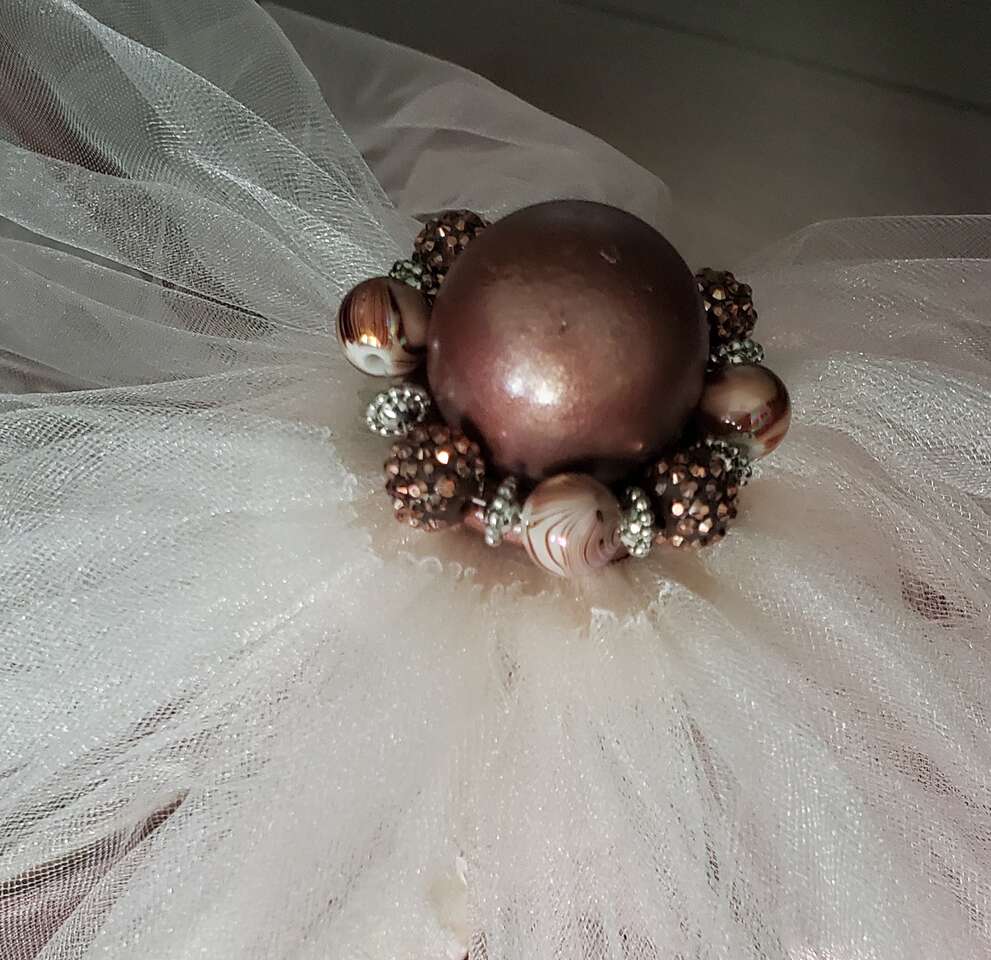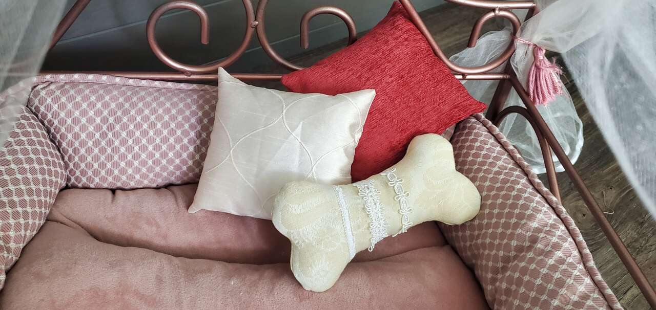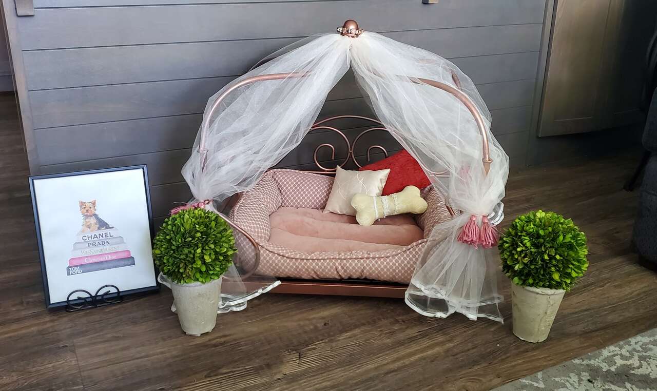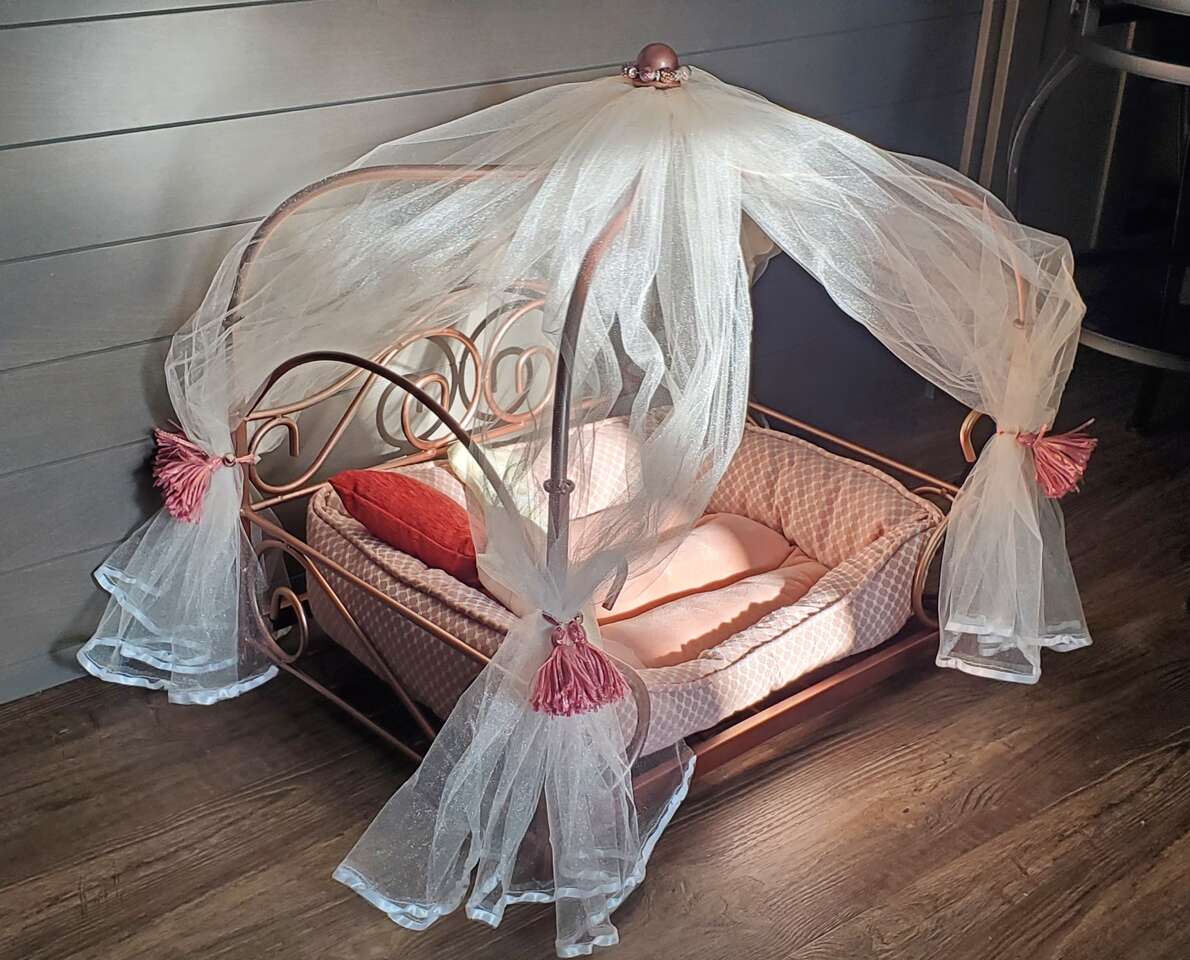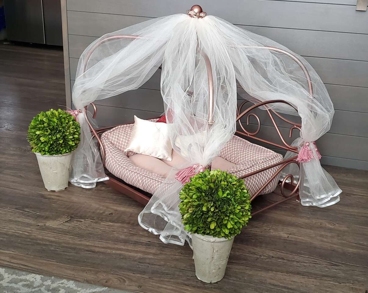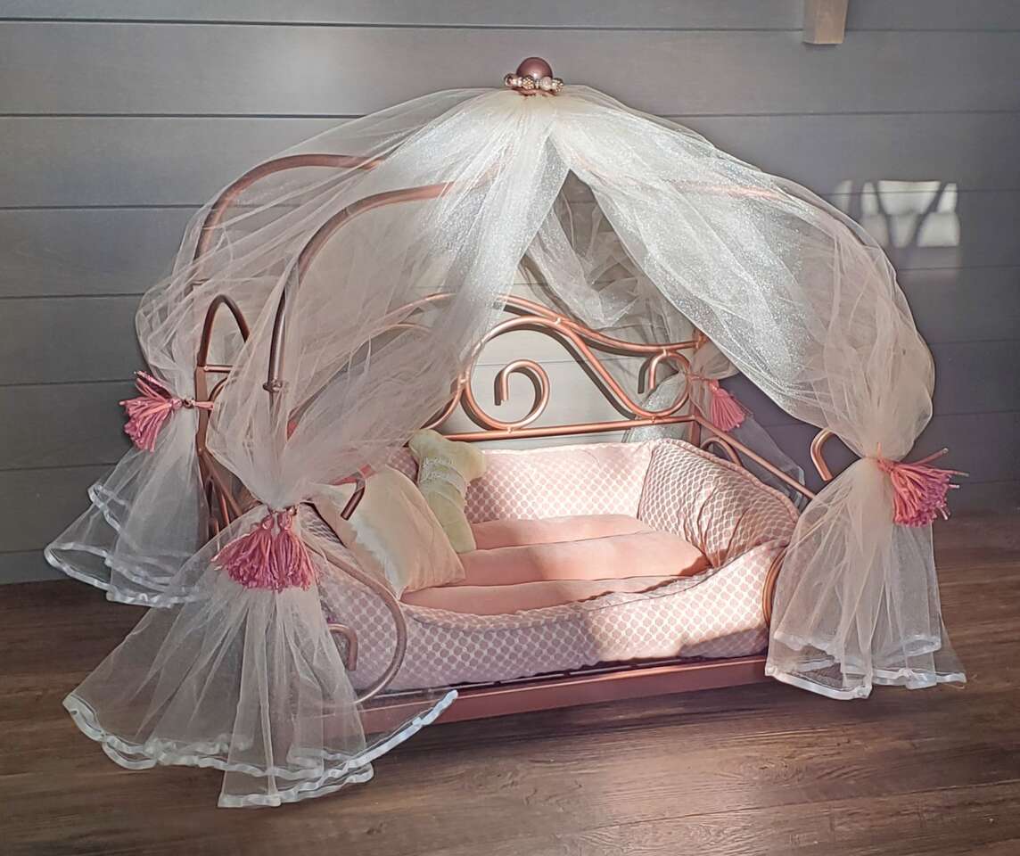 Pamper your pet with this elegant, one-of-a-kind iron pet bed has a been newly repainted a lovely, Rose Gold metallic paint. Everything else is BRAND NEW MATERIALS. It has a brand new soft, Coco Lane Couture plush pet bed cushion, is adorned with a custom handmade, shimmering, tulle removable canopy finished on top with a glitzy, ring of beads, handmade tassels with beads as tie backs for the canopy. It includes 3 tiny, accent pillows. One that is shaped like a bone. *(Dog picture, and plants not included.) Suitable for a small dog, or de-clawed cat. ;) It would ALSO be perfect as a BABY portrait prop!!