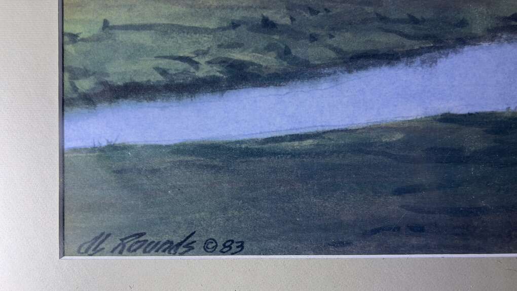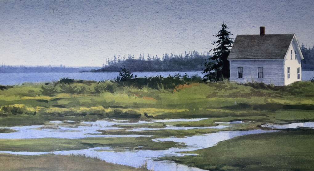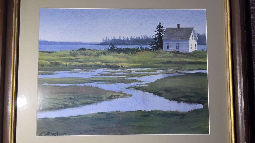 Venmo36x30 print called “Retreat” White cottage, Lake background Signed