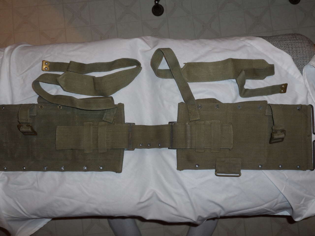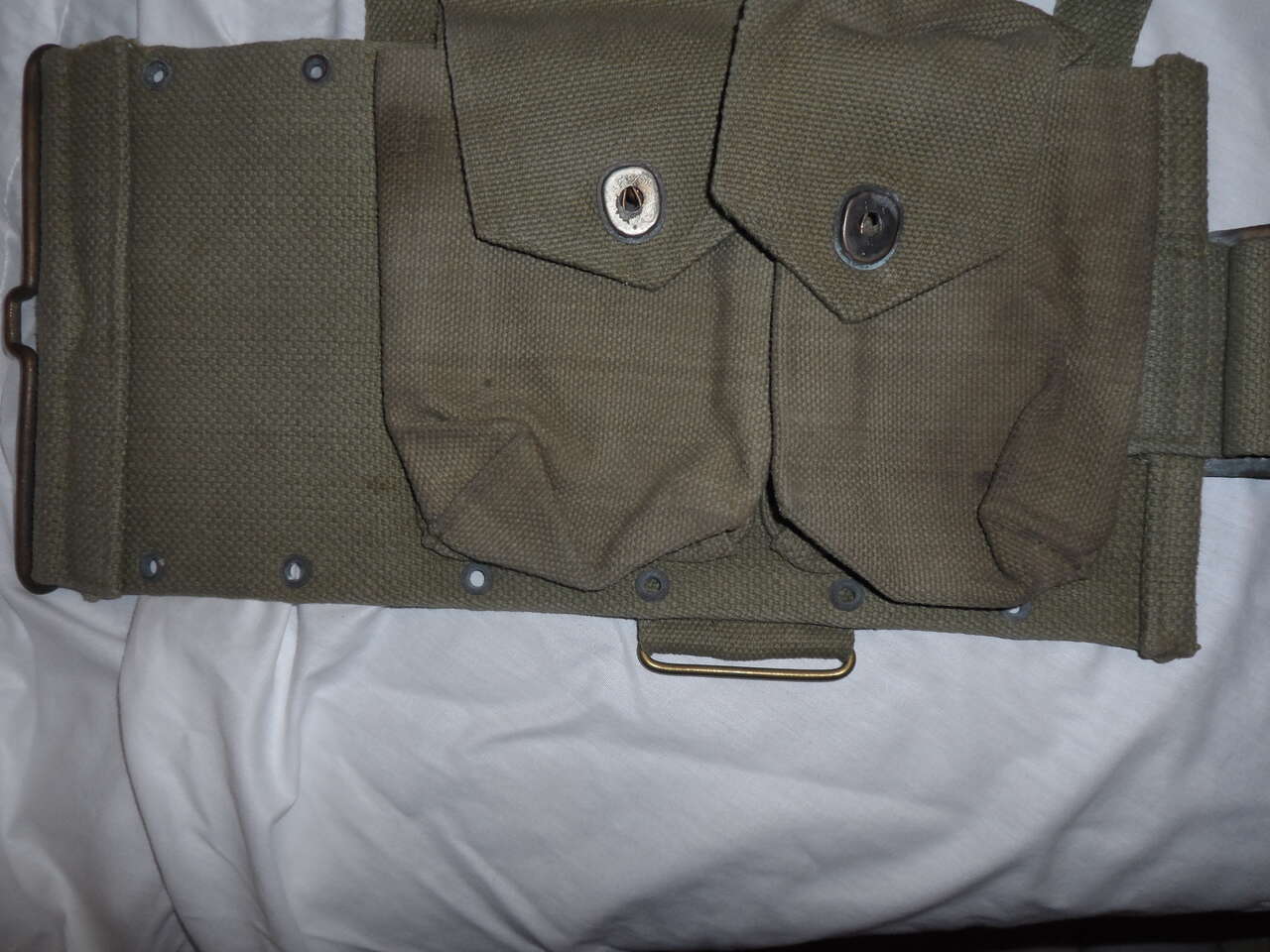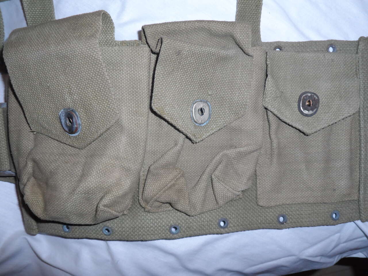 This is the BAR magazine belt worn by the assistant ammo carrier. It has 5 large mag pouches and one smaller pouch. The smaller being located at the right front of the belt. The larger pouches are for the BAR mags and the smaller would be for rifle clips not for .45 magaziines as there are no dividers. Belt is an early style as the brass "buckle" is the same width as the belt. Belt looks to be British/Belgian as the shoulder straps have small brass lined holes at the ends as well as a gap in the buckles. Pouch fasteners are marked 'FIX' not 'Lift the Dot'. Conditio9n of the belt is above average considering its age.