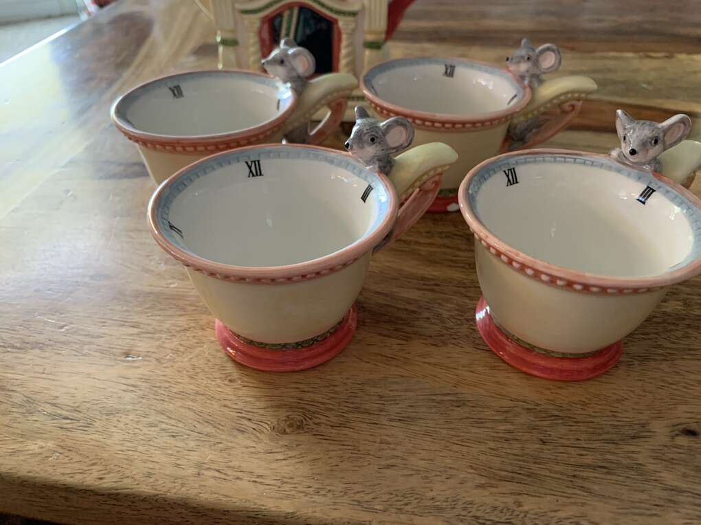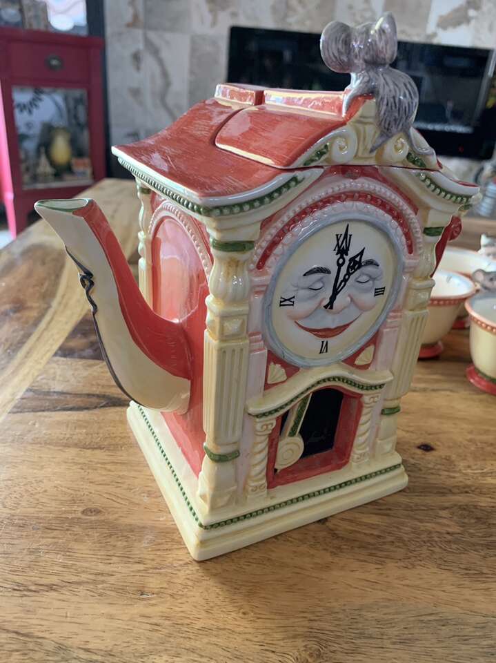 Department 56 Hickory Dickory Dock tea set from 1996. One teacup has a small chip, everything else is in excellent condition. Was used for display only. Pick up only CASH ONLY