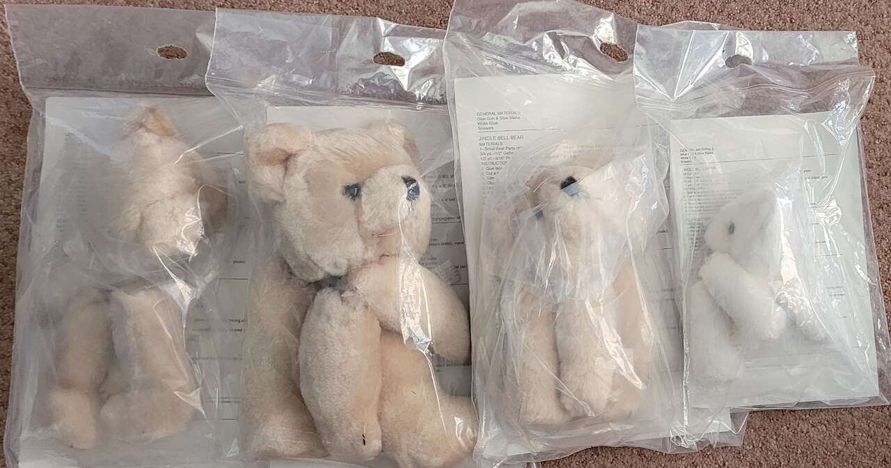 They are all new in unopened packages. The kits consist of the prestuffed bear head, arms and legs, and instructions for three easy to make projects. They can be added to a basket, large bell or other items suitable to be the body. They are for decorative purposed only and not intended as children's toys.