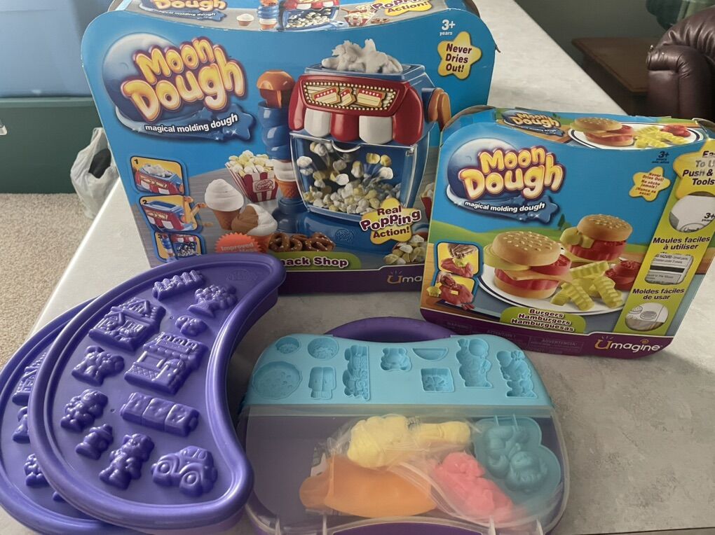 Includes two used sets (Snack Shop / Burgers and Fries) and two new sets (unopened moon dough and molds).