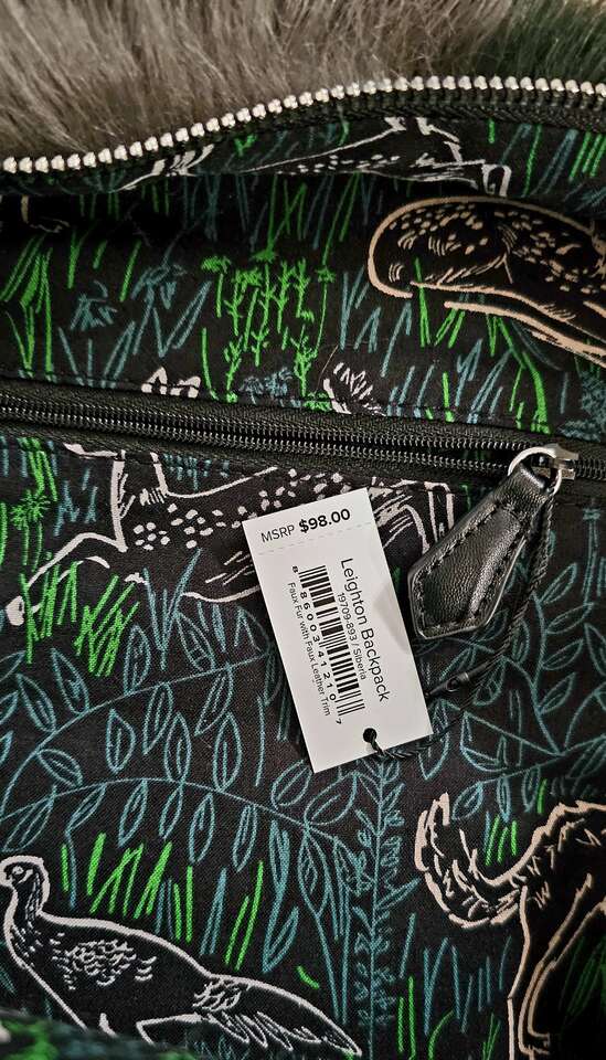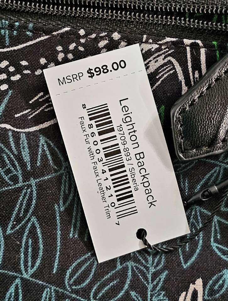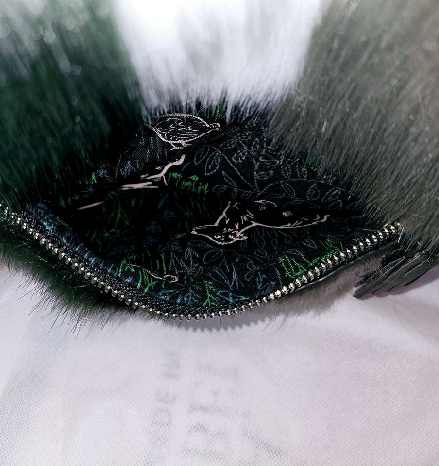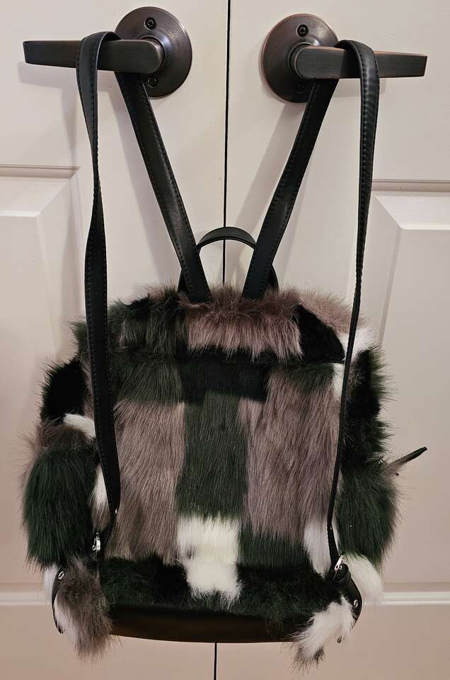Beautiful plush Faux fur and faux leather. Hidden slip pocket on back. Front zip pocket with tassel zipper pull. Two side slip pockets. Interior features two slips and a zip pocket. inside lining has complimenting animal print. Picture of tag shown inside bag.