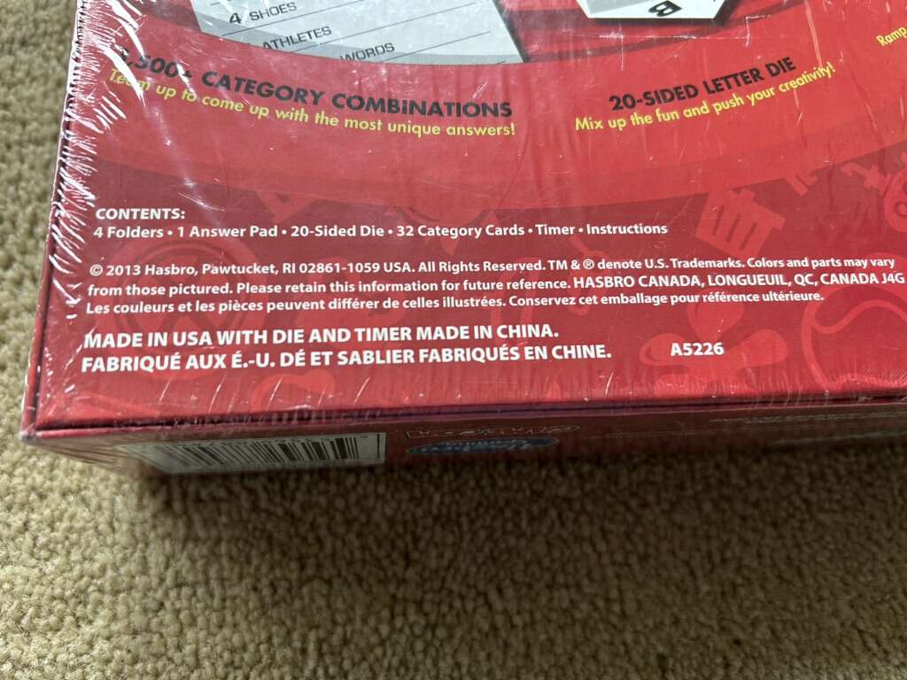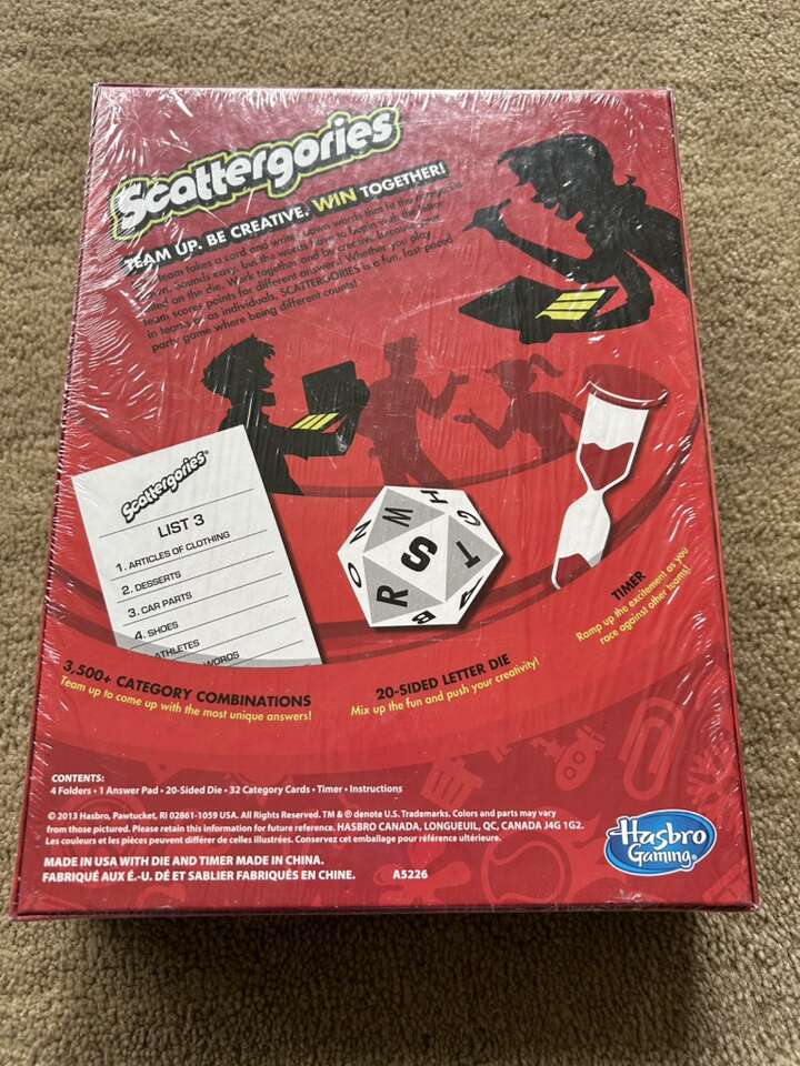 NEW (sealed in plastic) Scattergories: Team up in this fun, fast-paced game of categories! Hasbro Gaming, 2013. Ages 13+, 2-4 teams. New, unplayed condition. Text only. Cash or Venmo.