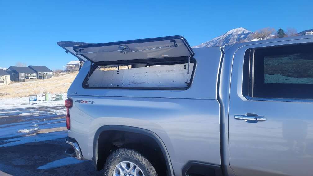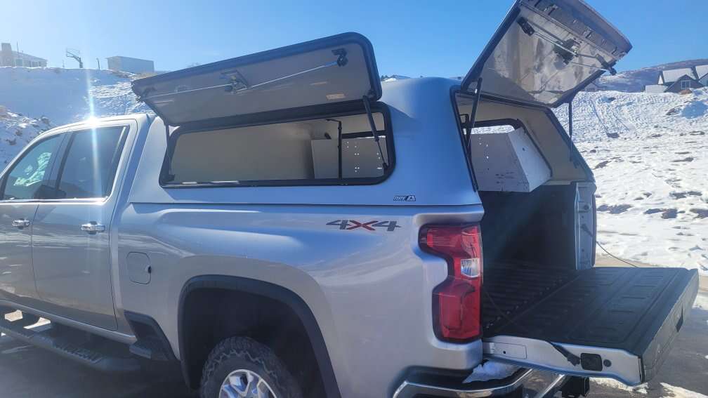 A.R.E HD Camper Shell for Silverado HD 2020 to 2025. I believe it would fit on a GMC Sierra too. Color matched to Chevy-Silver Ice Metalic. It is in great condition with upgraded T-Handle locks with two sets of keys. Needs gas shocks replaced on one side, about $20 bucks each. Mounting hardware included. These start new at $3200. Asking $2000 obo. This is located in Salt Lake City.