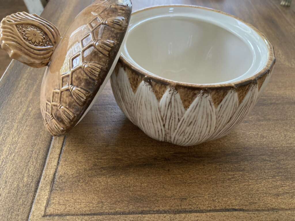 Ceramic candy jar. Measures 5” diameter and 3.5” tall with lid.