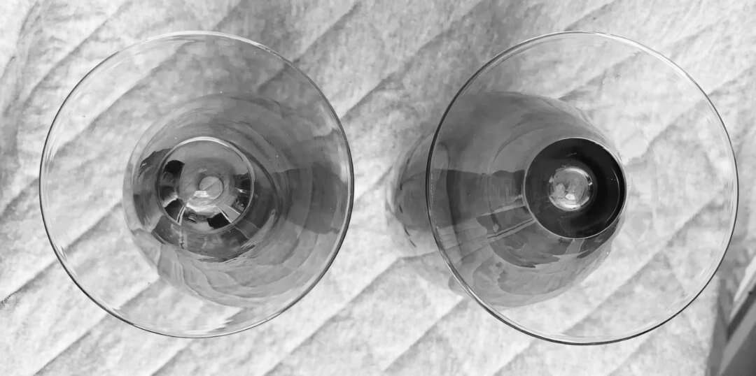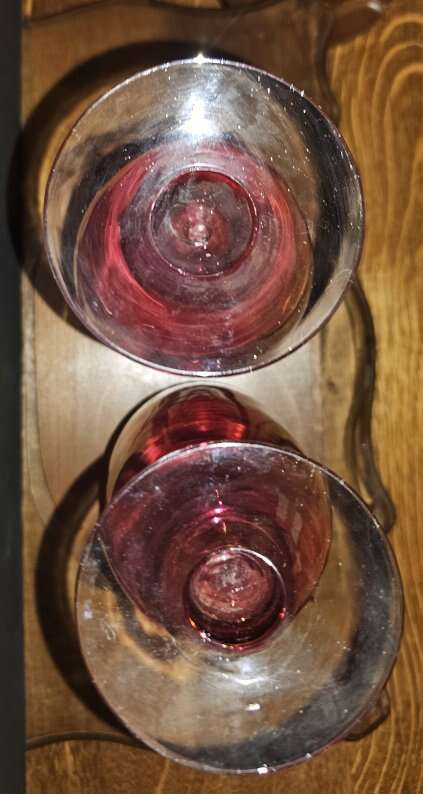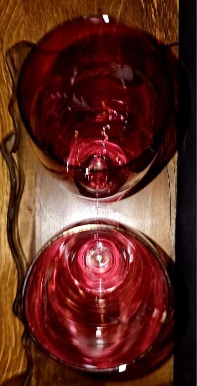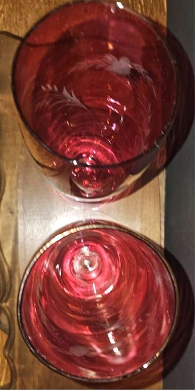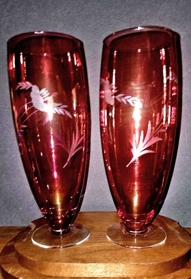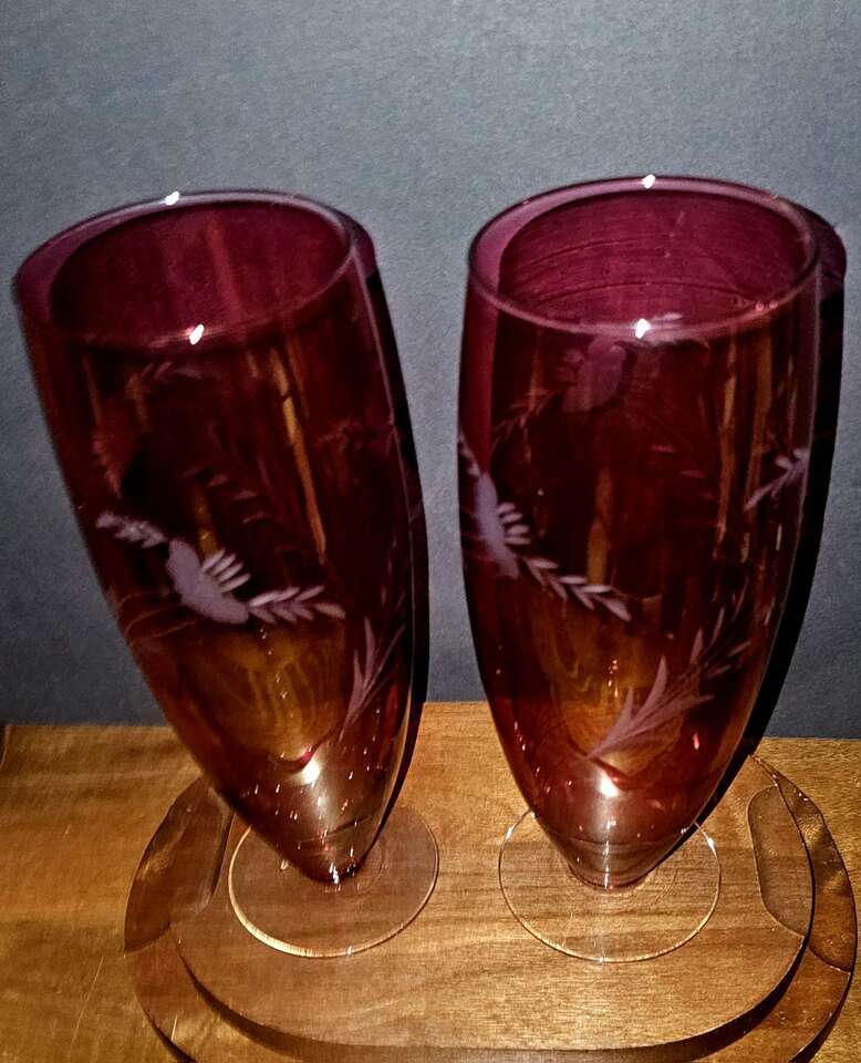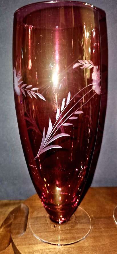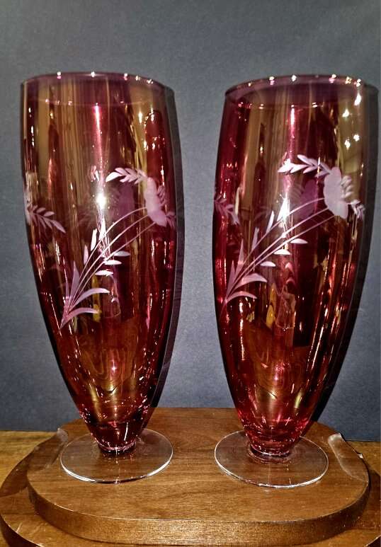 Vintage MCM 10" tall etched floral cranberry, clear footed, vases.