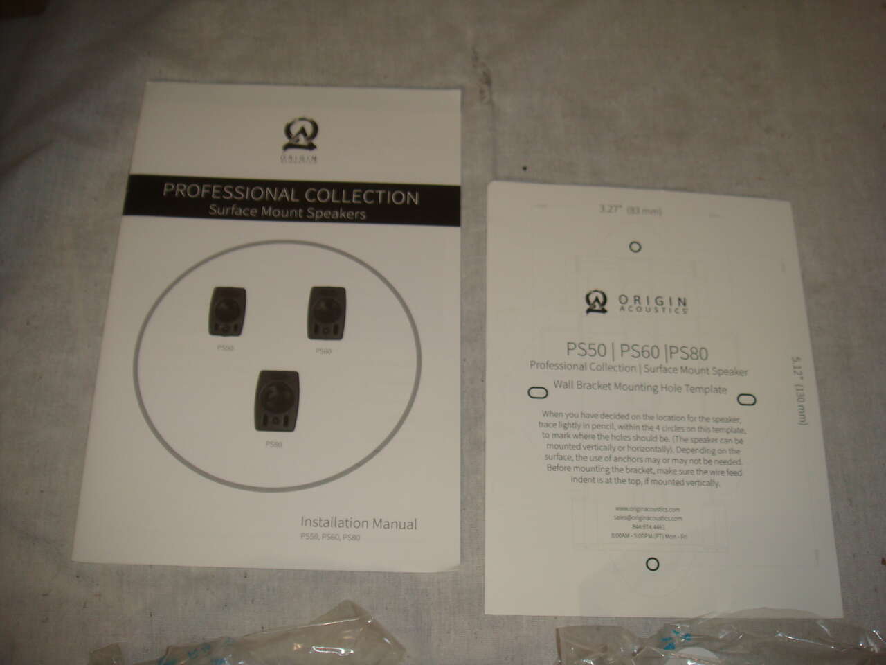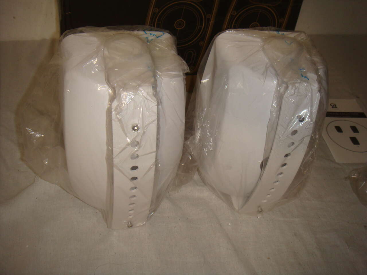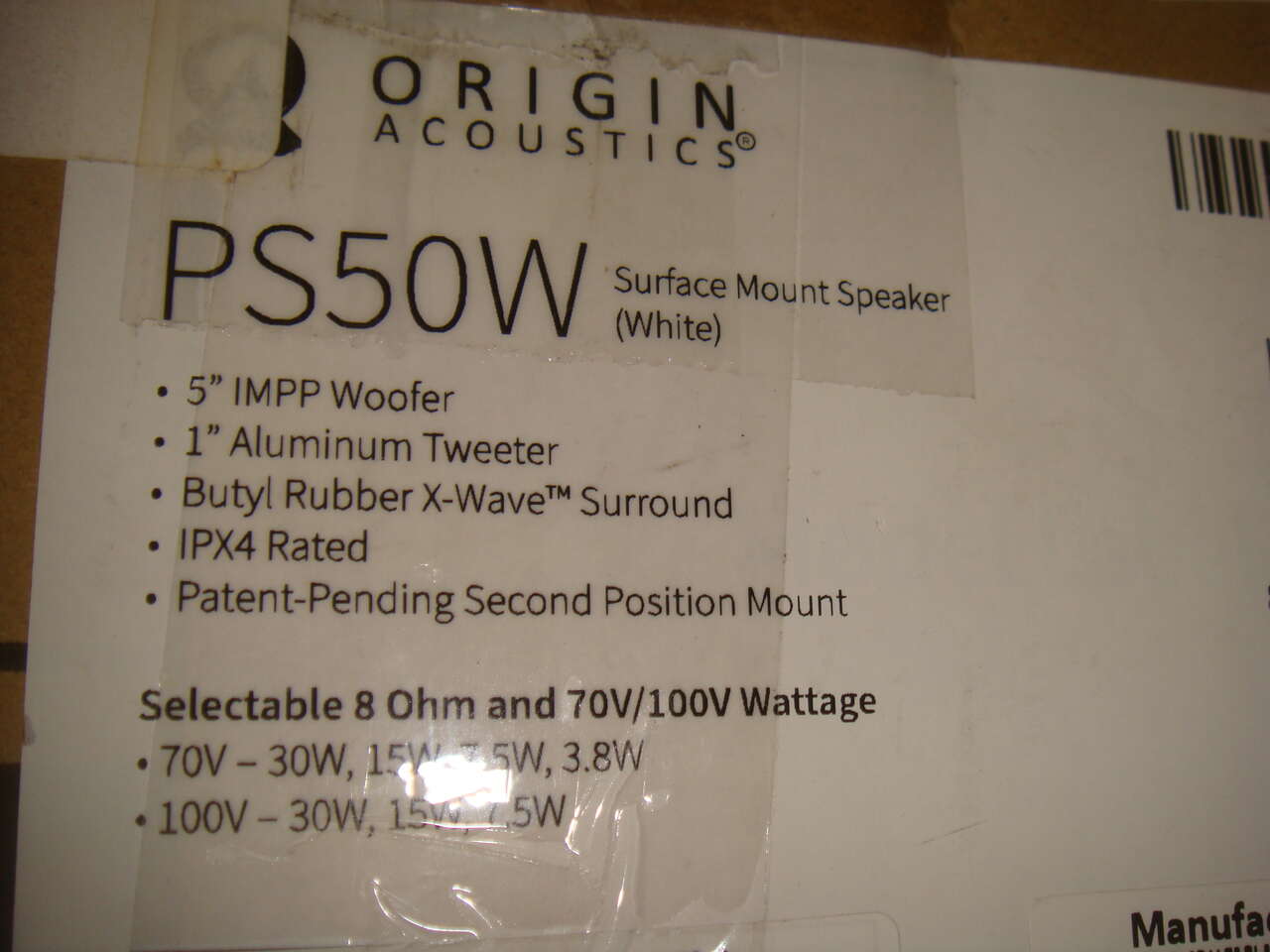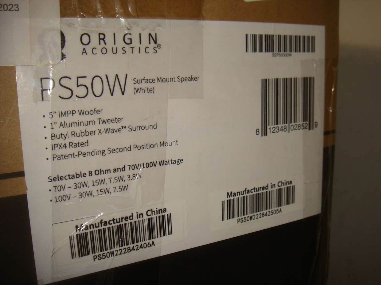 ONE PAIR OF ORIGIN ACOUSTICS PS50W PROFESSIONAL SURFACE MOUNT INDOOR/OUTDOOR SPEAKERS IN WHITE. These are brand new, only opened for the photos but never used or removed from the plastic. The original box was slightly distressed, but the contents were untouched and are in new, perfect condition. These are IPX4 waterproof rated. It comes with everything shown. These normally sell for $540+. This is your chance to save big-time so don't miss out!!