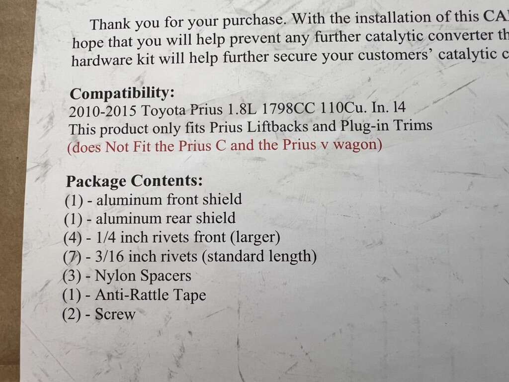 VenmoPackage Contents: Aluminum front shield Aluminum rear shield 1/4 inch rivets front (larger) 3/16 inch rivets Nylon spacers Anti-Rattle Tape Screw