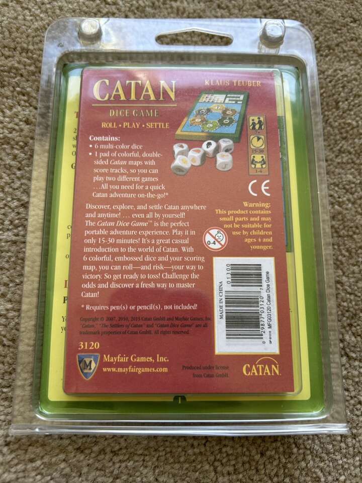NEW (sealed in package) Klaus Teuber’s Catan Dice Game: Roll, Play, Settle. Variation on the classic Settlers of Catan board game. All you need for a quick Catan adventure on-the-go! By Mayfair Games, 2015. New, unplayed condition. Text only. Cash or Venmo.