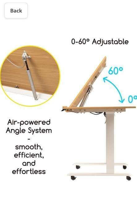 About this item ADJUSTABLE TILTING TABLETOP: Designed for creators who work a long time on the table, the electric drafting table is easy to adjust the height from 31.5" to 51.2" and angle from 0 to 60° to always remain in a proper position when writing, reading, and drawing. LARGE DESIGN: The 40 x 27" large tabletop provides a large enough workspace for extra-large design drafts. The tilted desktop is supported by air-powered angle system, withstanding a maximum weight of 176lb. QUALITY MACHINERY: The concealed dual machinery under the tabletop barely makes a sound while lifting. The speed will remain the same as 25mm/s for years of heavy-duty use. The whole working process won't disturb a soul. USER-CENTERED DETAILS: The large side board stores all the handy items - pencils, magazines, tablet PCs... The table comes with buckles to be used to organize the cords. The smooth casters will ensure all your placing needs in an ample space smoothly while the lock stops the table stably. MEEDEN for ULTIMATE SATISFACTION: MEEDEN is more like a family with hundreds of members wholly dedicated to helping you succeed in your artistic endeavors through high-quality, unique art supplies. And like a family, we stick together, and if anything goes south, you can always rely on MEEDEN, through thick and thin - give us a little sign - a mail, a call, or a message.