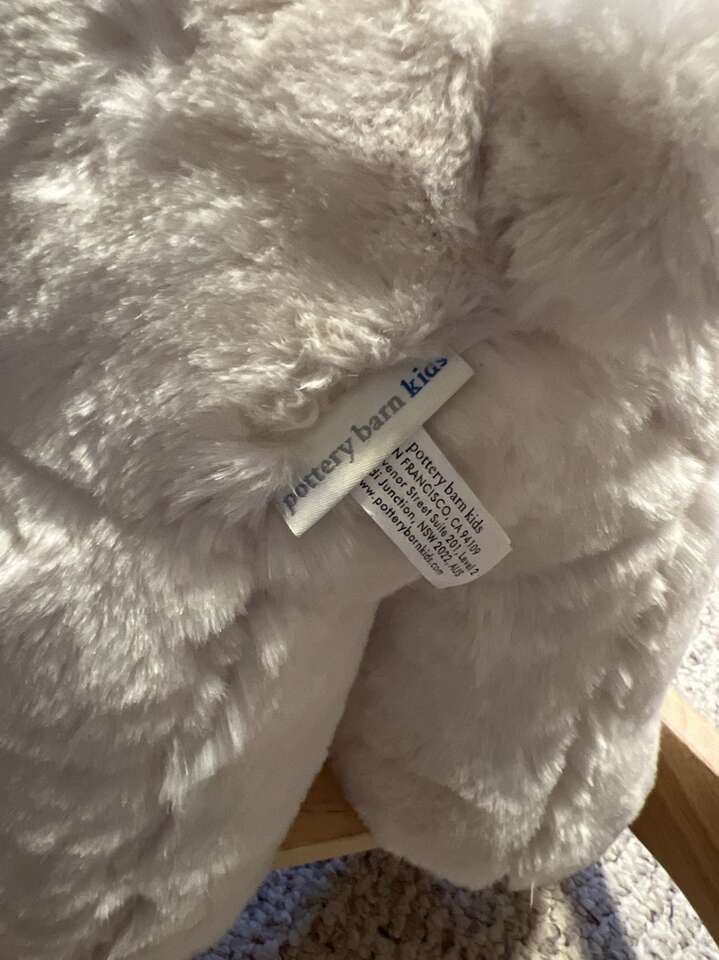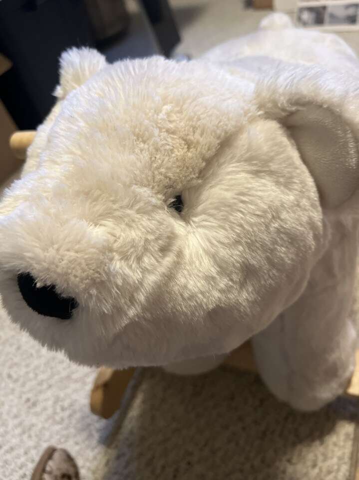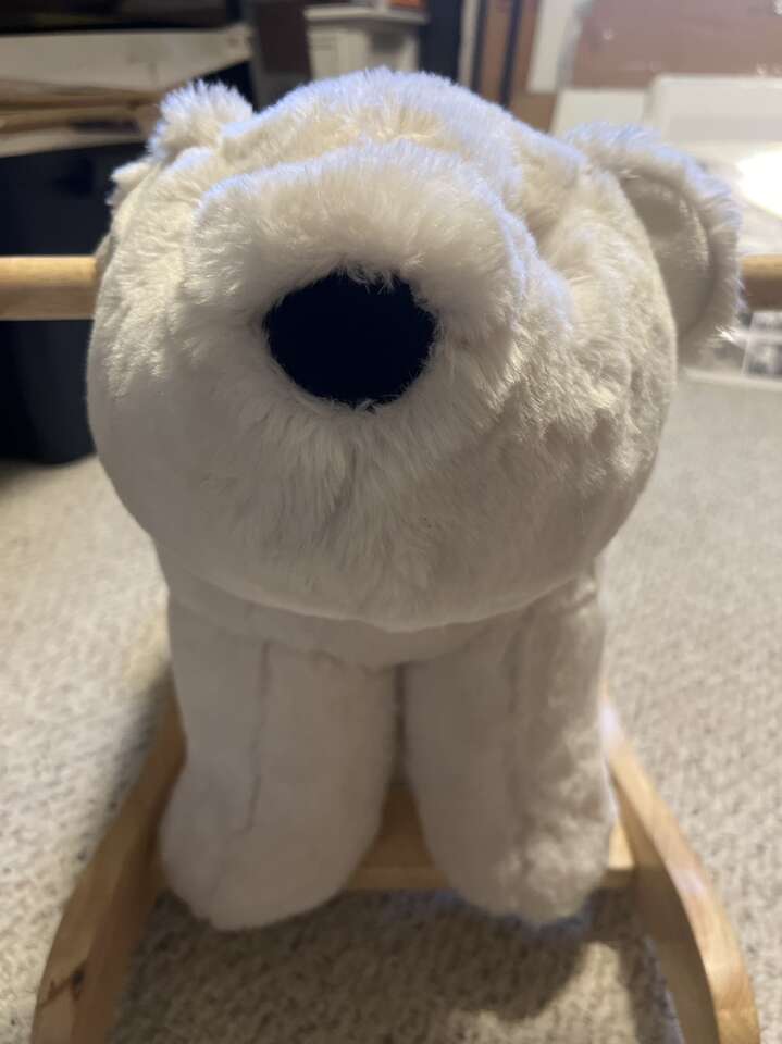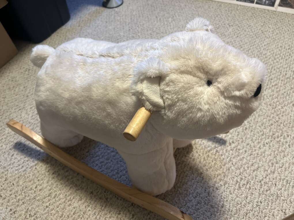 26 long x 13.5 wide x 20” high. Runners are crafted of solid wood for a smooth, secure and gentle rocking motion. Bear is expertly made of faux fur and firmly stuffed with polyester fibers. Wood handles make steady grips. Retailed for $179, and no longer available.