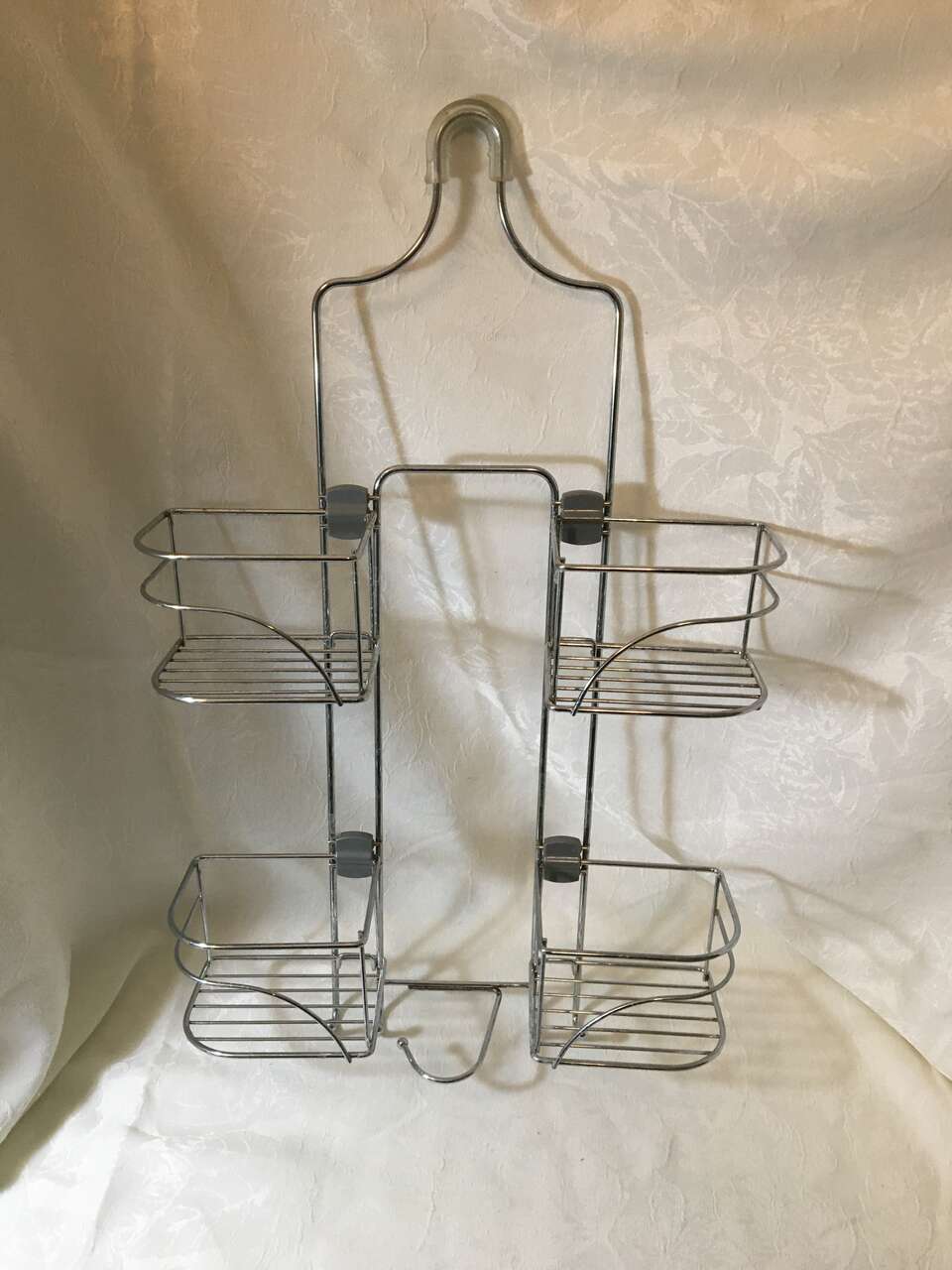 Silver in color. Can hold 4 to 8 bottles of shampoo & conditioner, body wash. Convient hooks for scrubys and bathroom back scubbs. Moveable shelves to make more room.
