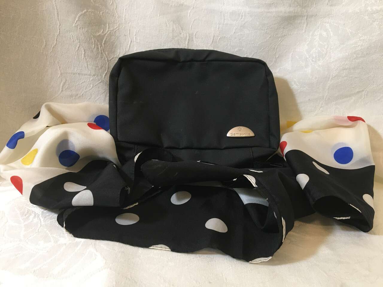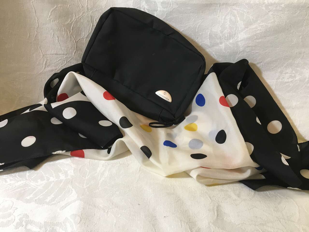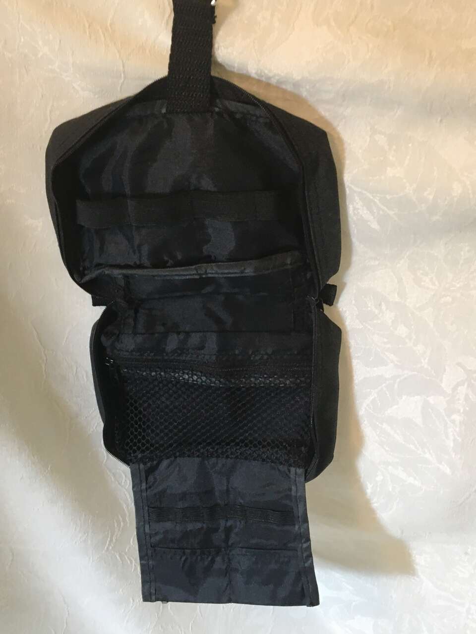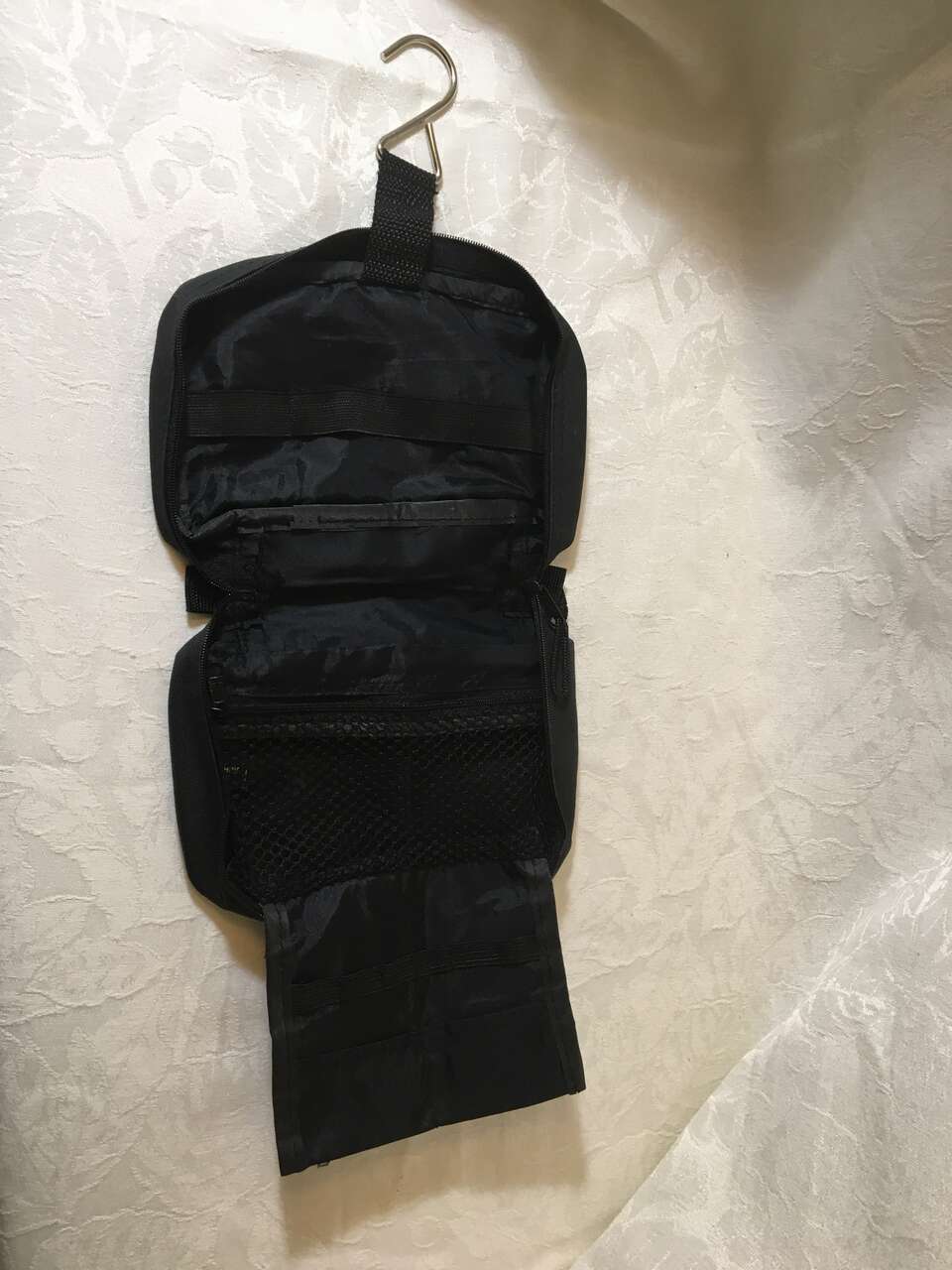 Black in color. 8 x16 so It's small for convenient travel needs. Can store makup brushes, razors. It has a hook to hang up for easy convenience or ready to go travel.