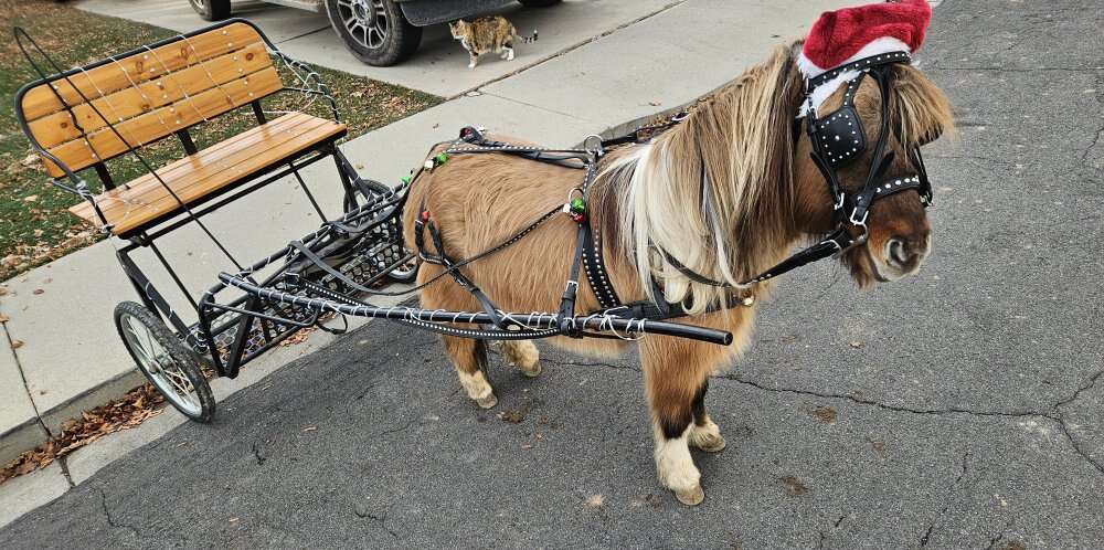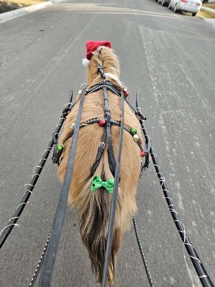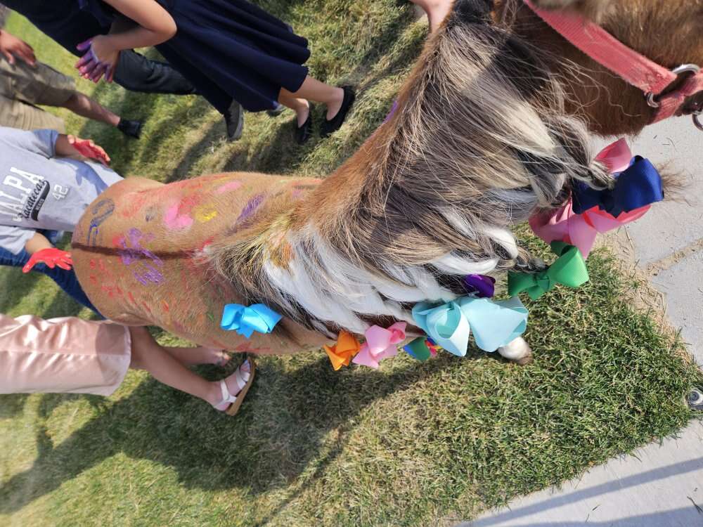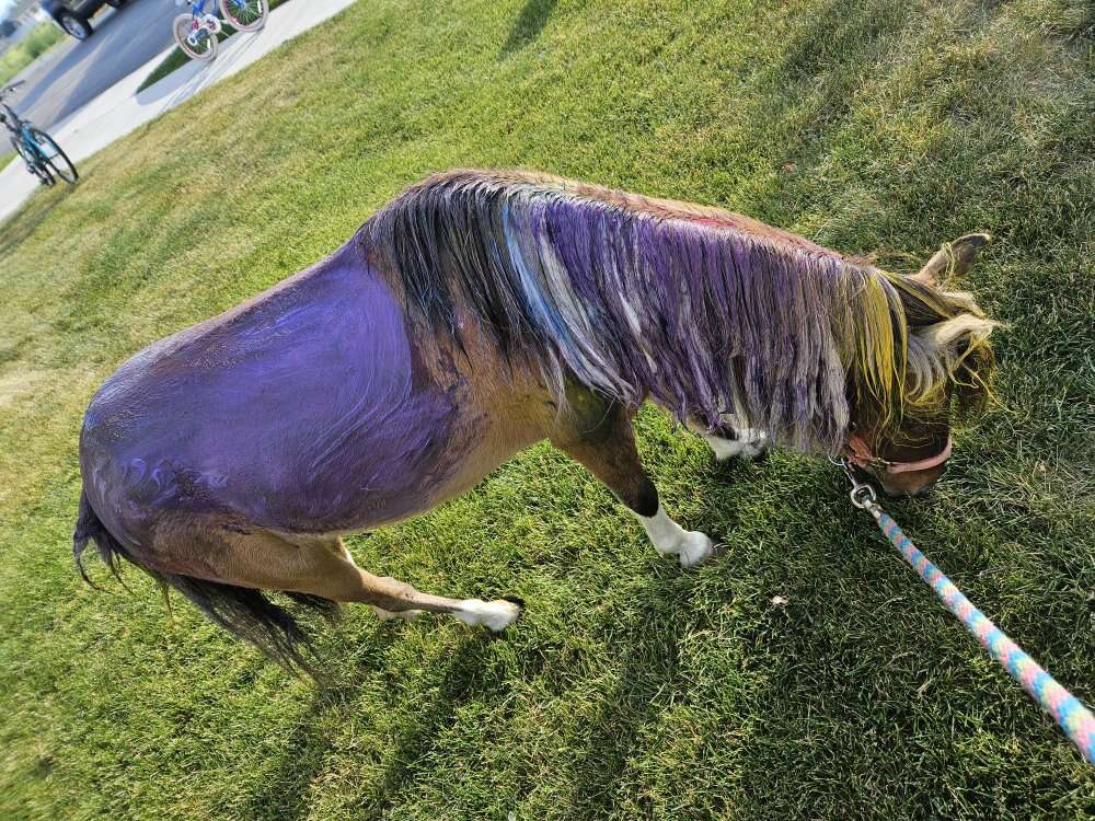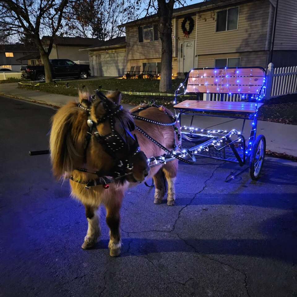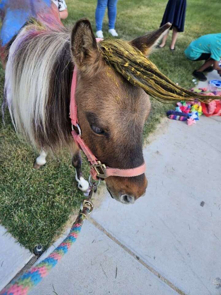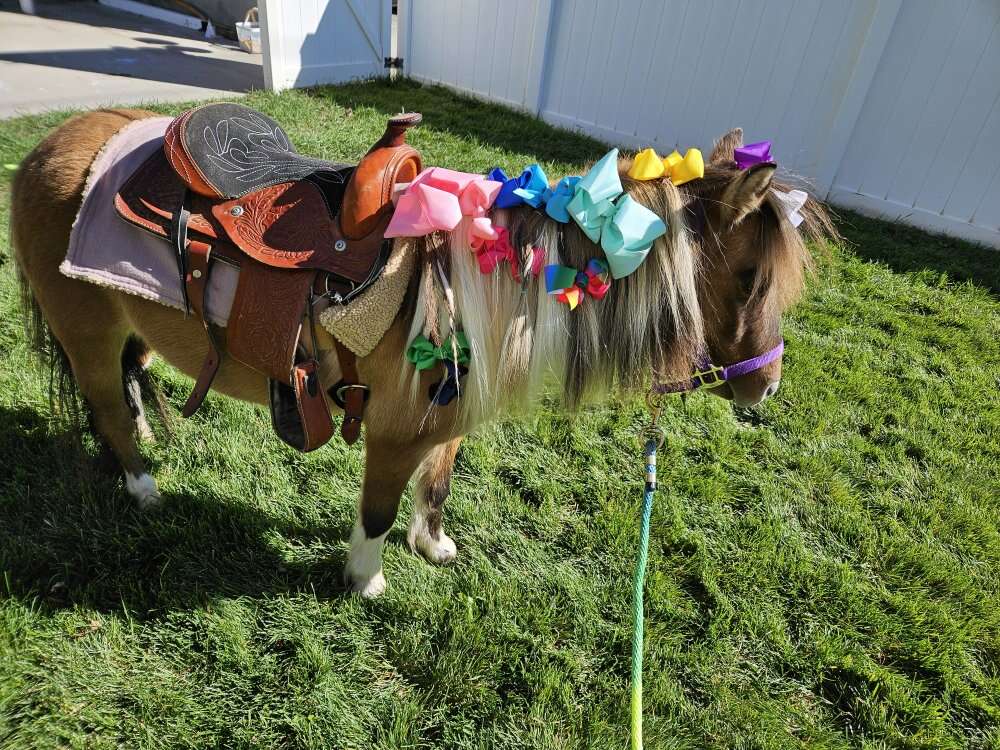 She comes to you and your event with everything she needs. You'll be able to spend time riding or driving with her, leading her around, and of course, brushing and pampering her with pretty bows and flowers! She even has a unicorn horn she can come with. Or if you have a different costume or event idea you would like, let me know.