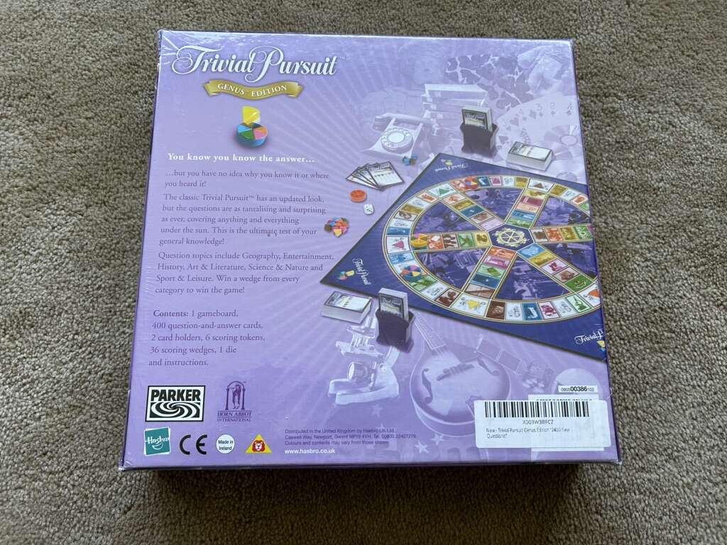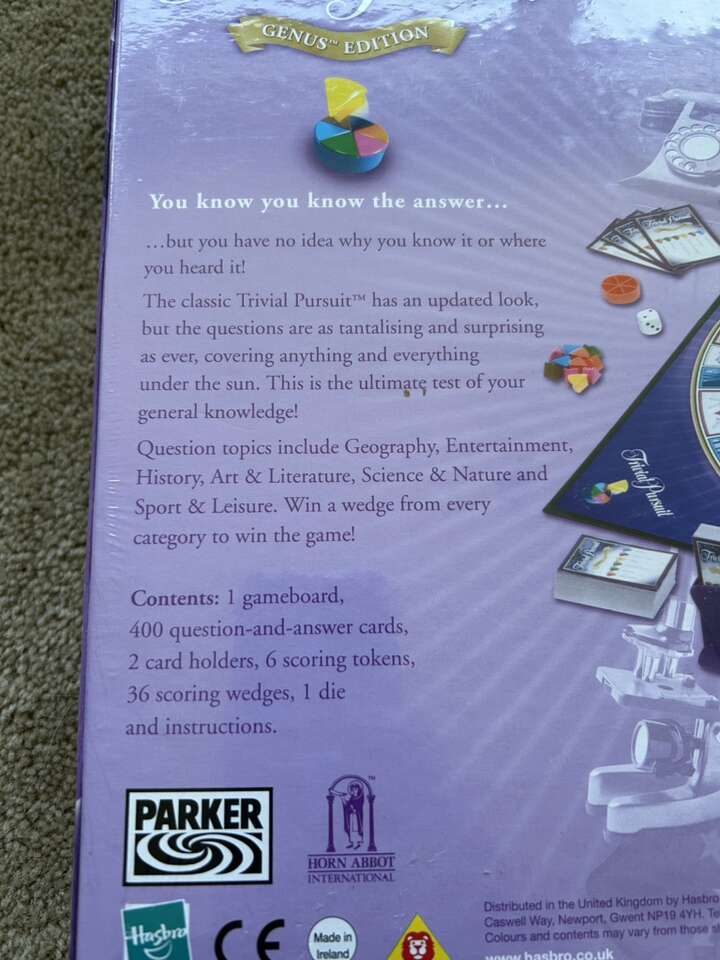 NEW (sealed in plastic) Trivial Pursuit: Genus Edition. The Ultimate Trivia Challenge! 2400 questions & answers. Horn Abbot International, 2005. Ages 15+, 2-36 players. New, unopened condition. Text only. Cash or Venmo.