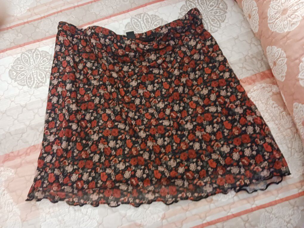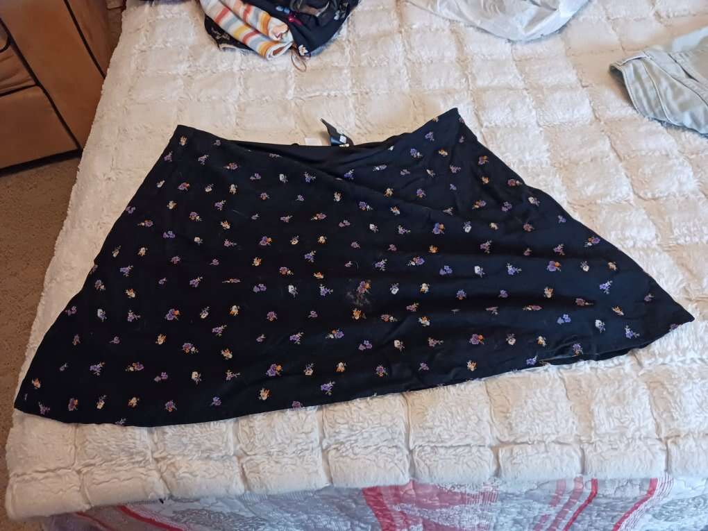 3 short skirts size 14/16/XL but all fit same Sz L. Black patterned and light blue jeans skirt. Small multi flower pattern. All for 10.00.