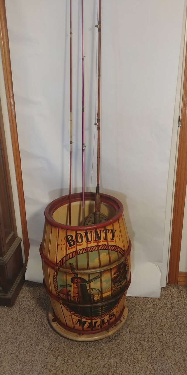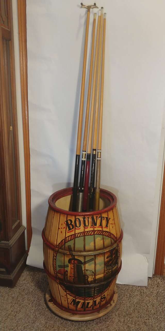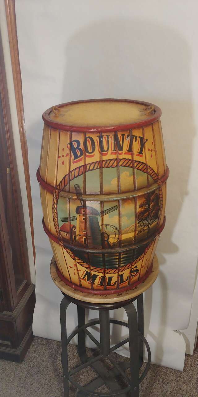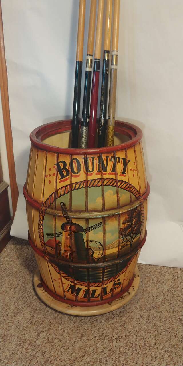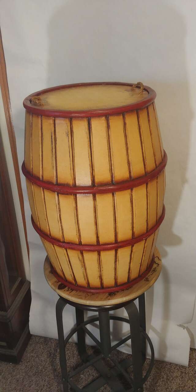 VenmoWooden barrel with lid. Great decor. Use for umbrellas, pool cues, fishing poles or just a garage can. Just a cool look. Size 22 high 16.5 round.