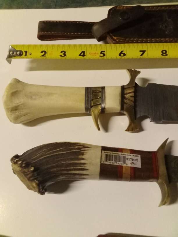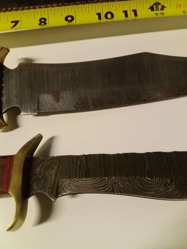 Australian Red deer Horn handle Damascus blade knives one 16 in and one 13 in with leather sheets 150 dollars