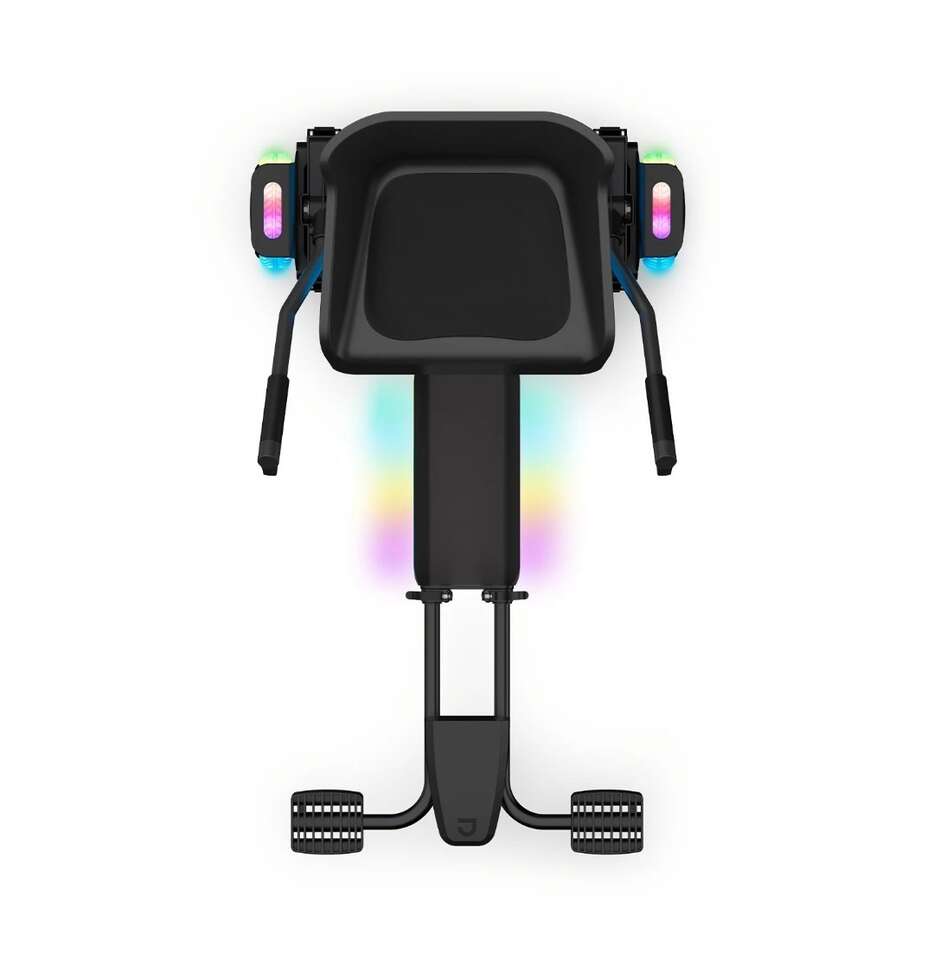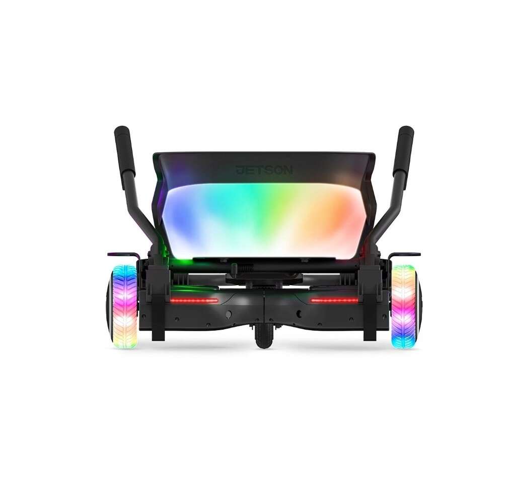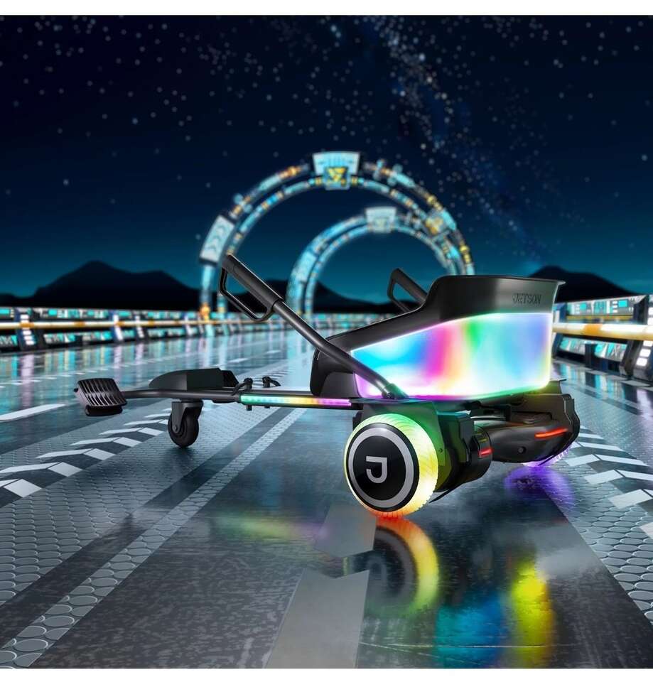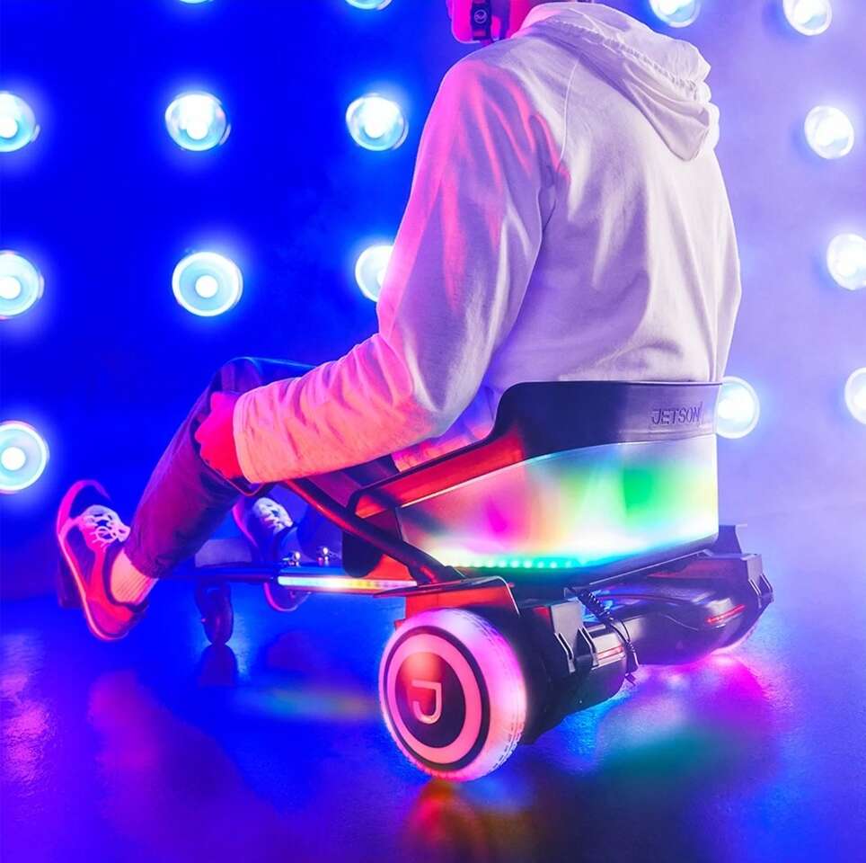 Get out there and ride for fun while putting on a show for the neighborhood when you zip around on the Crush Light-Up JetKart + Hoverboard. It's a modern-day go-kart powered and propelled by its partner hoverboard. Not only are the moves it makes mesmerizing, but the Crush also captivates attention with kaleidoscopic LED illumination. The ultra-vibrant lights are made even more intense when streaming a rad soundtrack through the built-in Bluetooth speaker–they pulse in sync to the beats of your songs.