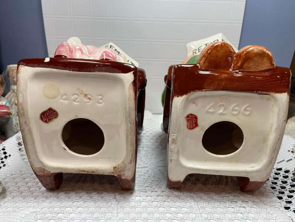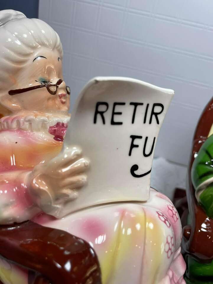 Lefton Retirement Fund Banks no stoppers. $10 each. Two small chips on the lady; one on corner of paper, the other along the bottom as shown in pictures. These are approximately 7.5 inches tall.