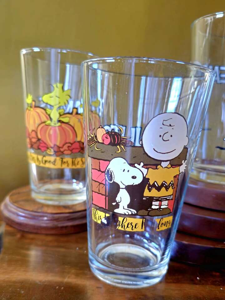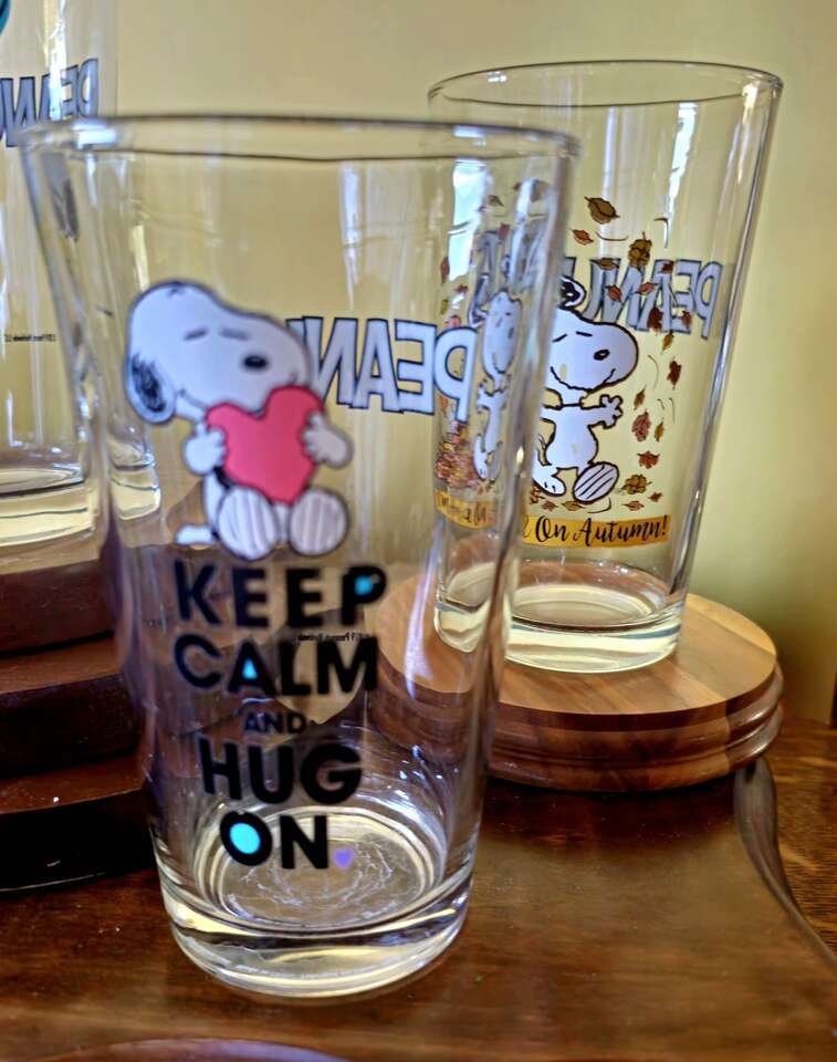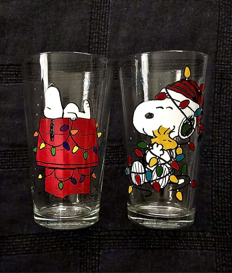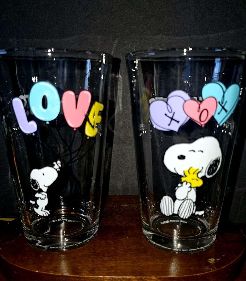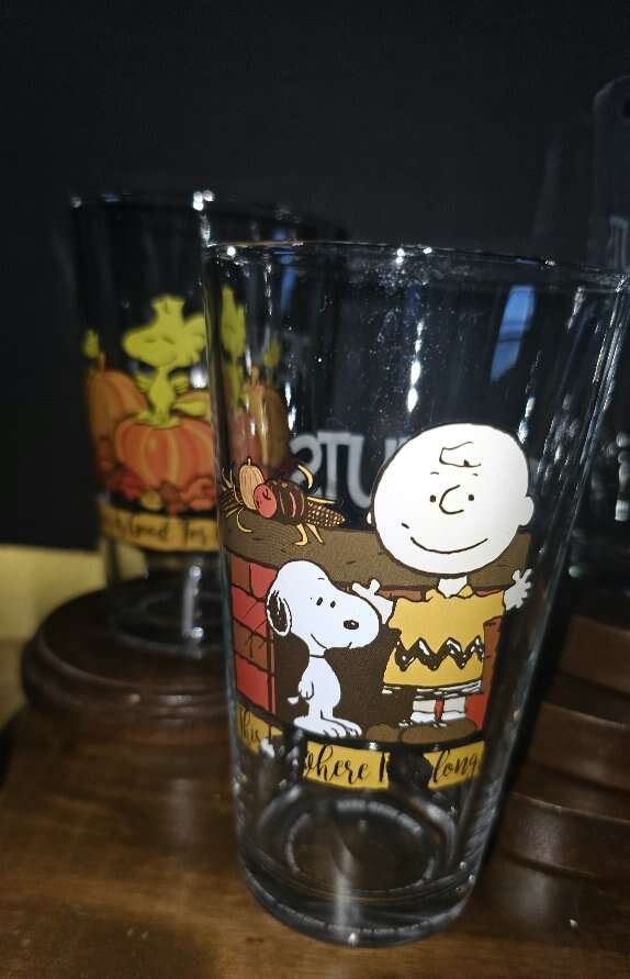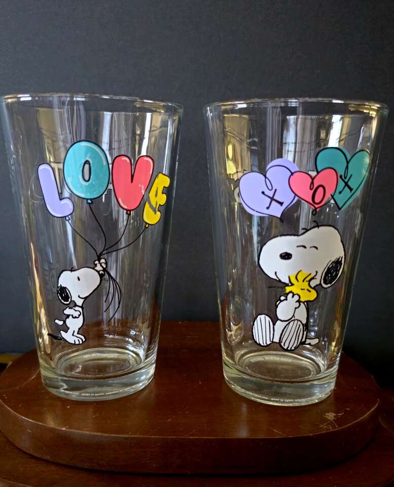 Group of 8 enduring, darling, vintage Peanuts & The Gang 16 oz. Glass Tumblers with cute graphics.