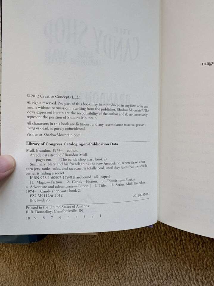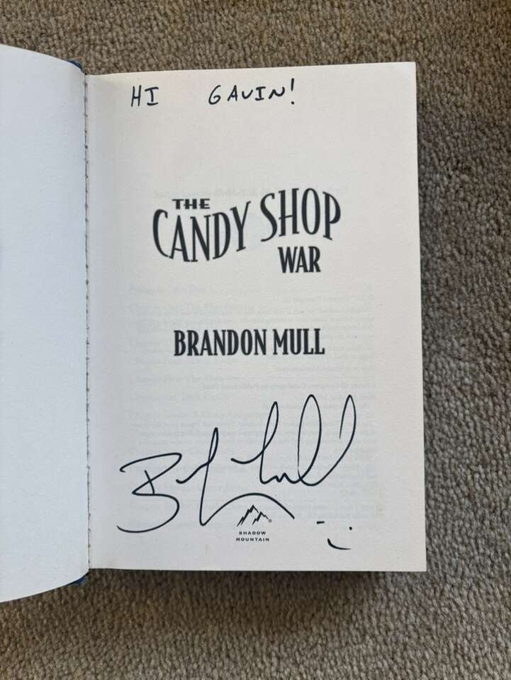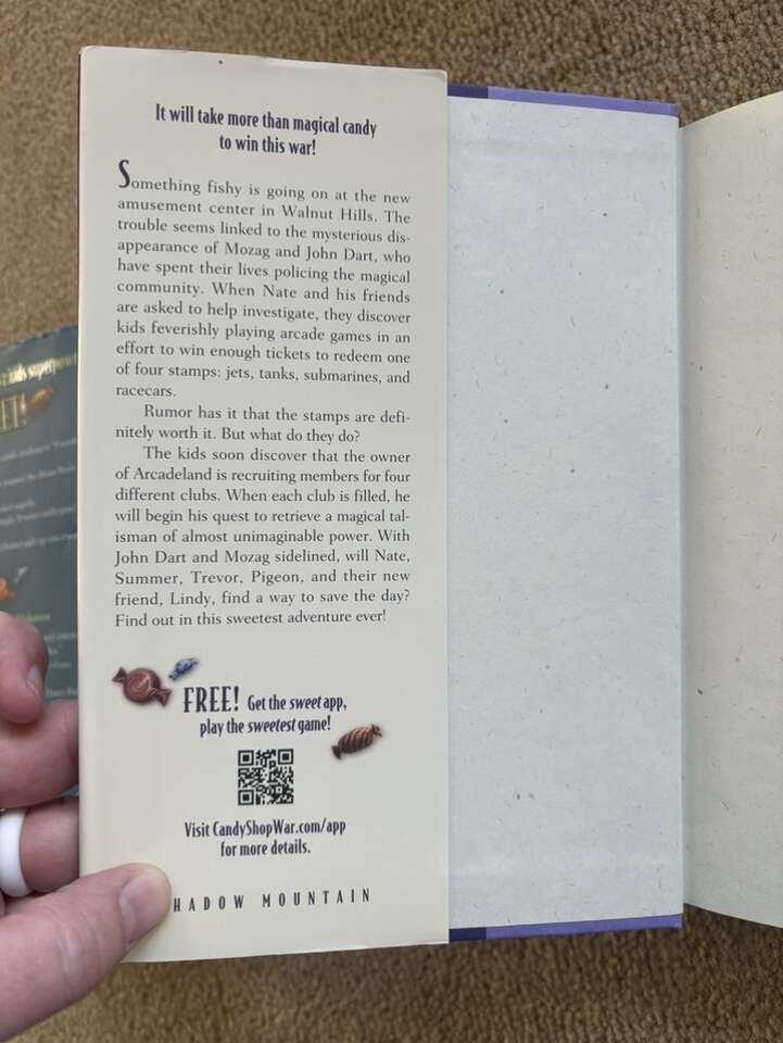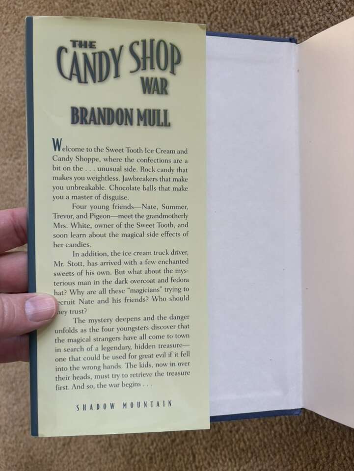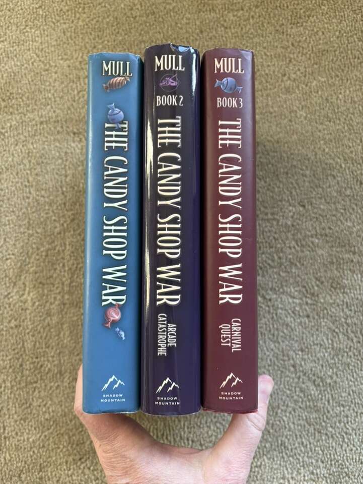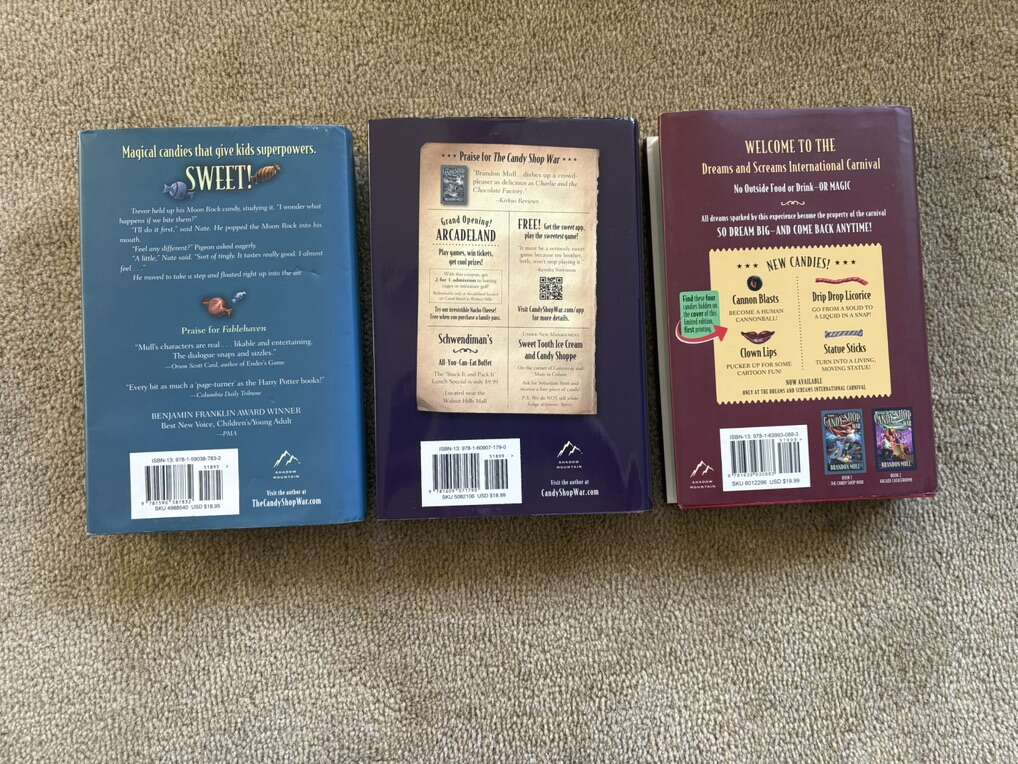 The Candy Shop War (2007, 407 pages--SIGNED with inscription on title page), The Candy Shop War: Arcade Catastrophe (2012, 433 pages), and The Candy Shop War: Carnival Quest (2023, 390 pages). Complete series by Brandon Mull (bestselling author of the Fablehaven series). Published by Shadow Mountain. First edition hardcovers. Book 1 in good condition, with slight wear on edges and corners, some damage to bottom inside of dust jacket. Books 2 and 3 in excellent, like new condition, including dust jackets. Book 2 includes a bonus card game (new, intact). Text only. Cash or Venmo.