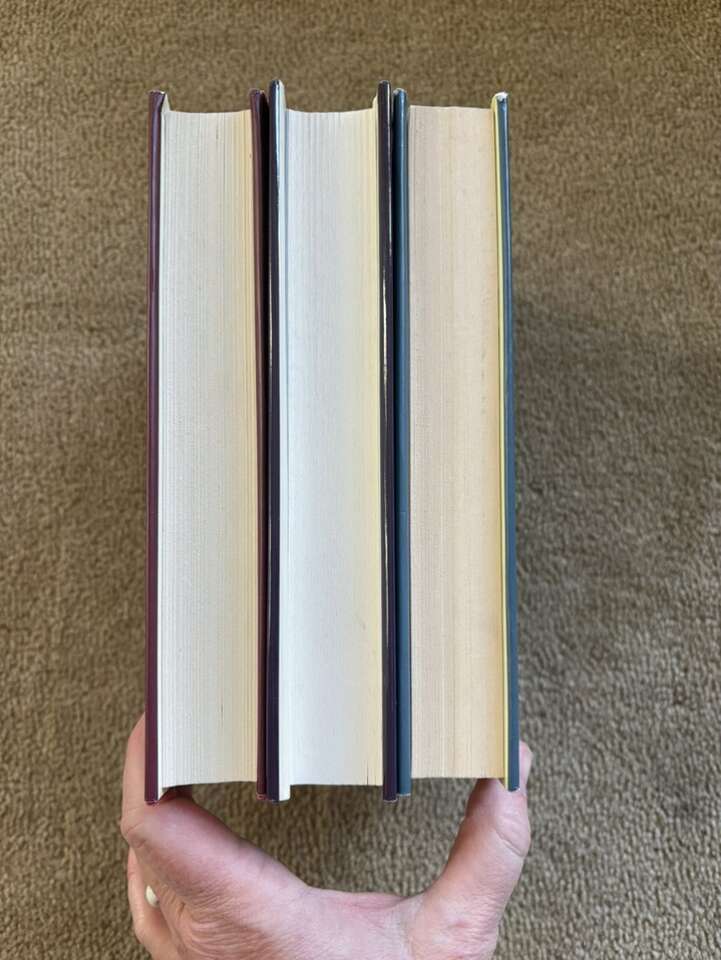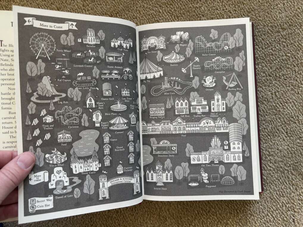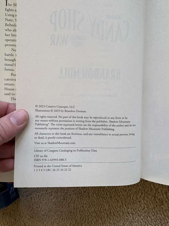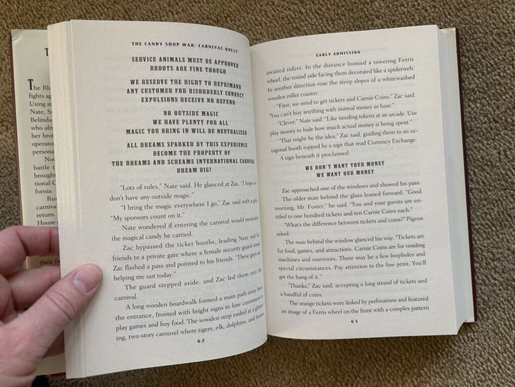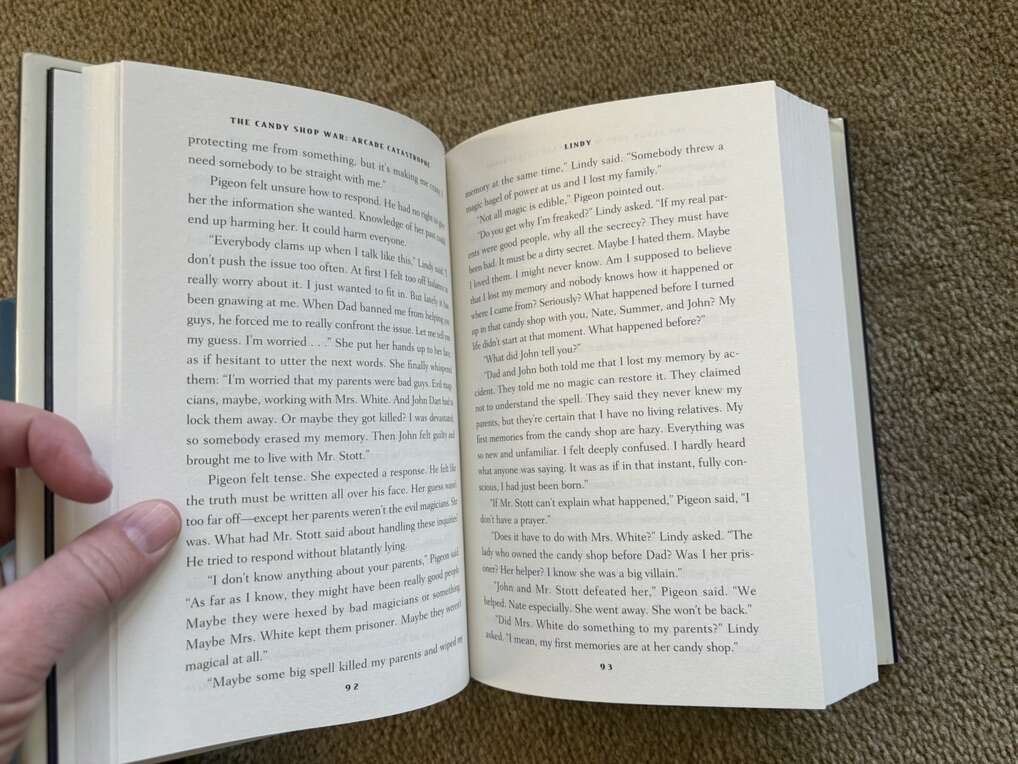The Candy Shop War (2007, 407 pages--SIGNED with inscription on title page), The Candy Shop War: Arcade Catastrophe (2012, 433 pages), and The Candy Shop War: Carnival Quest (2023, 390 pages). Complete series by Brandon Mull (bestselling author of the Fablehaven series). Published by Shadow Mountain. First edition hardcovers. Book 1 in good condition, with slight wear on edges and corners, some damage to bottom inside of dust jacket. Books 2 and 3 in excellent, like new condition, including dust jackets. Book 2 includes a bonus card game (new, intact). Text only. Cash or Venmo.