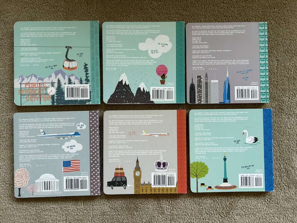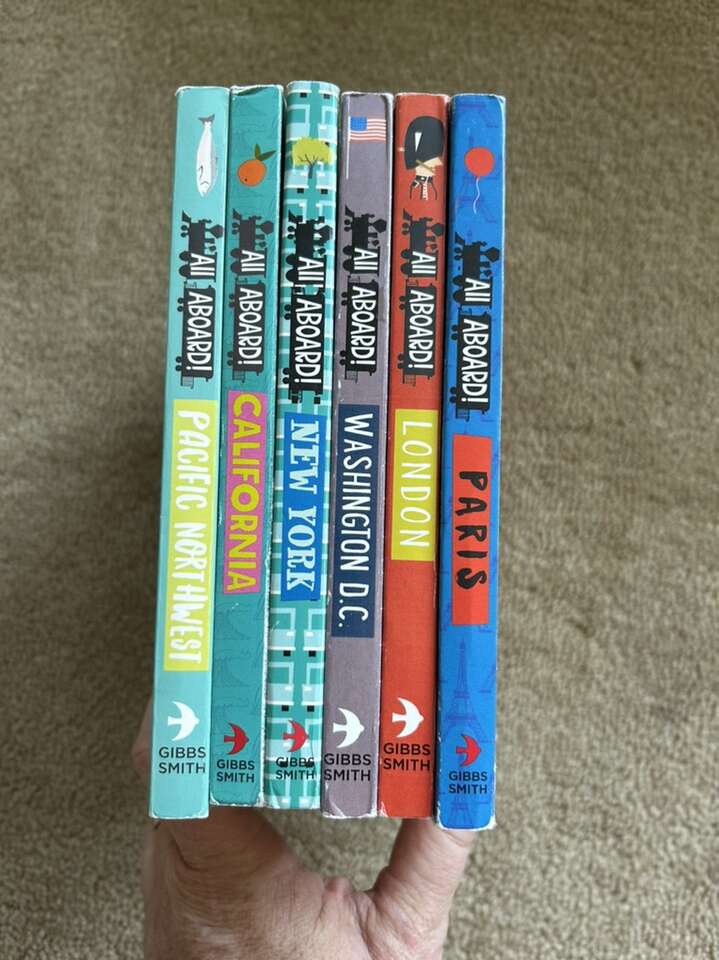 Six All Aboard! Board Books: Pacific Northwest, California, New York, Washington DC, London, and Paris. By Kevin & Haily Meyers, Art by Haily Meyers. Gibbs Smith, 2015-2017. Very good condition. Text only. Cash or Venmo.