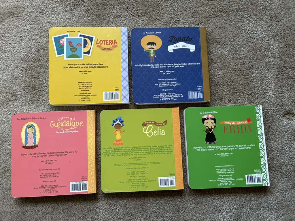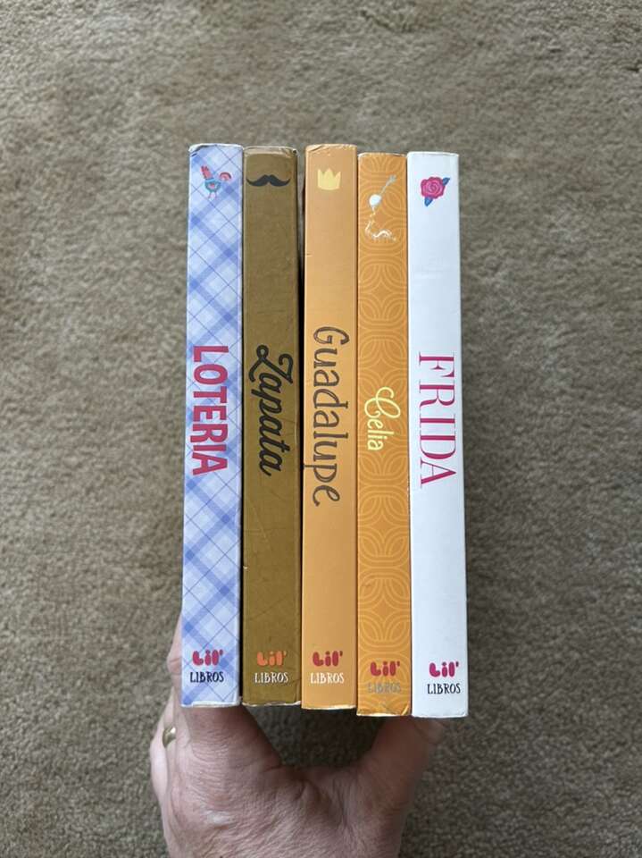 Five Lil’ Libros Board Books, by Patty Rodriguez and Ariana Stein. Loteria, Zapata, Guadalupe, Celia, and Frida. Spanish/English bilingual educational books, 7”x7” (same size as BabyLit books), published by Little Libros. Very good condition, slight wear on a couple of edges. Text only. Cash or Venmo. Discount on multiple items.